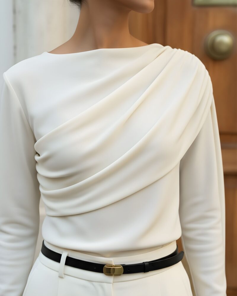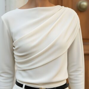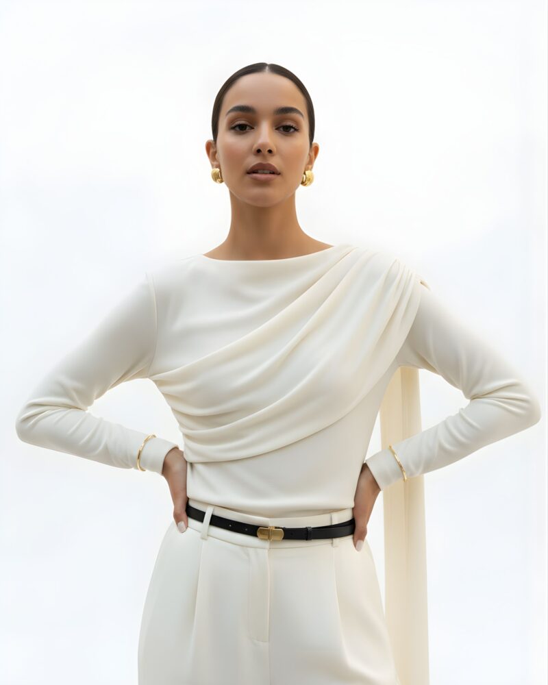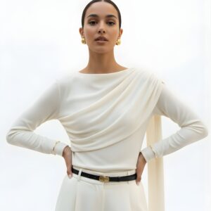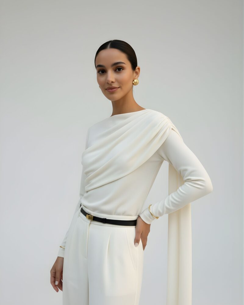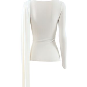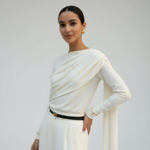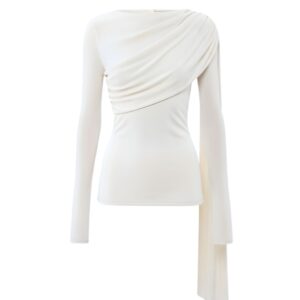 Elegancka, miękko układająca się bluzka z dzianiny z naturalnego jedwabiu. Asymetryczne drapowanie od ramienia modeluje linię biustu i talii, a długi, opadający panel nadaje stylizacji biżuteryjny charakter. Smukła sylwetka, gładkie wykończenie i subtelny połysk jedwabiu sprawiają, że to idealny top na dzień i wieczór.