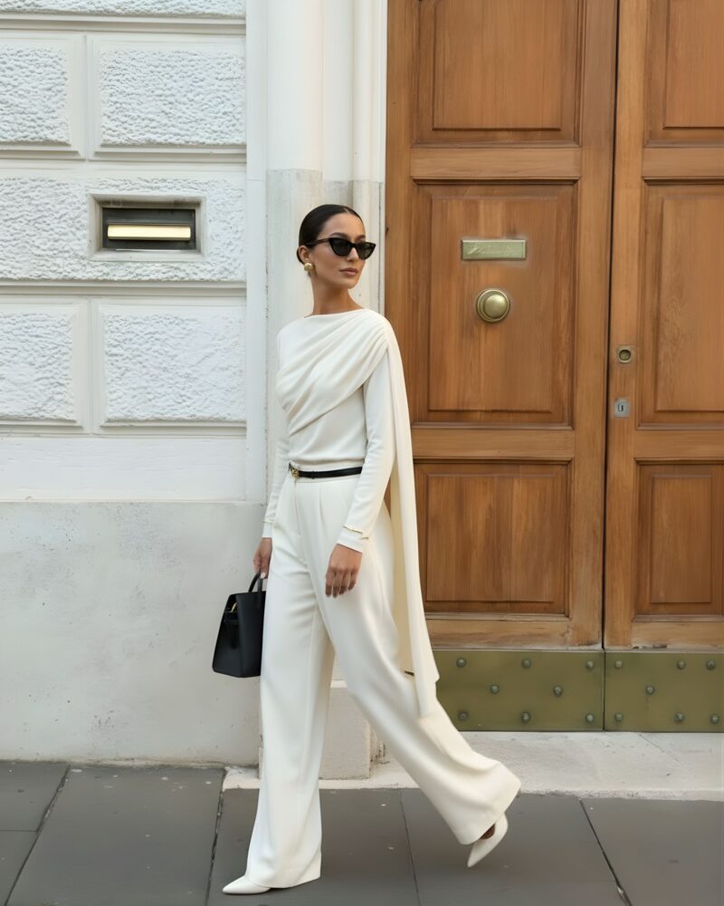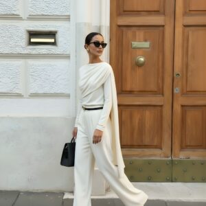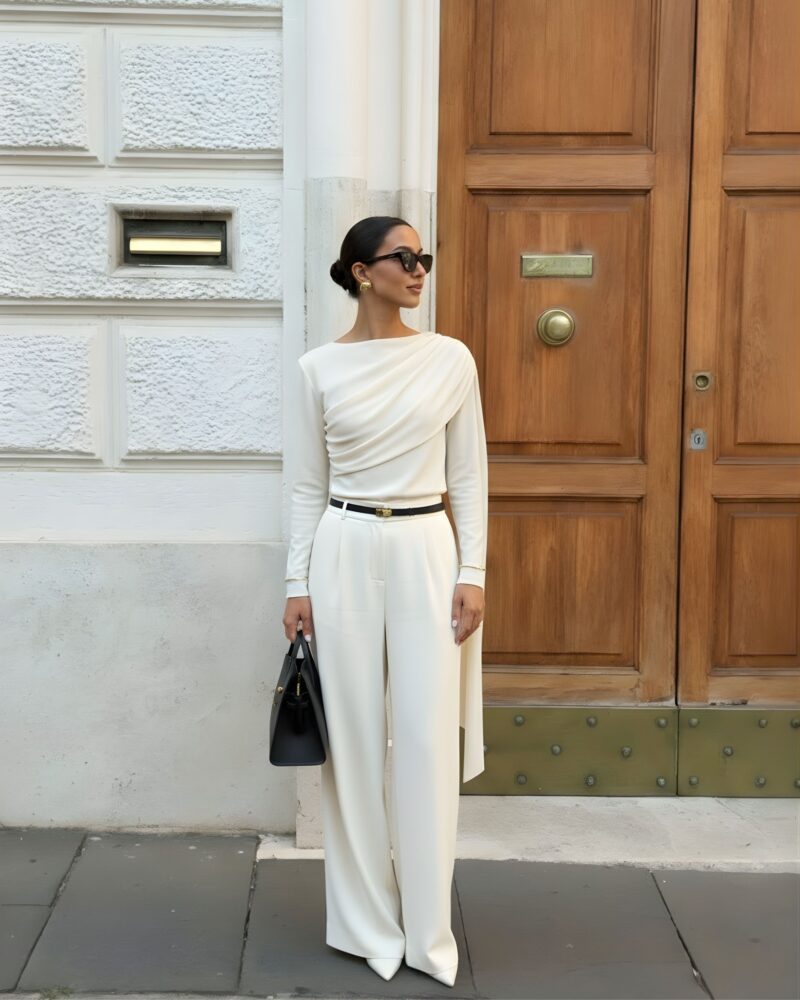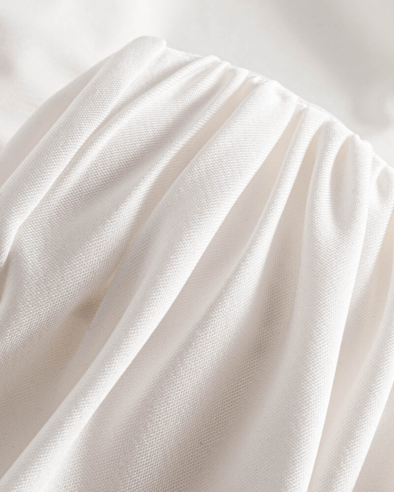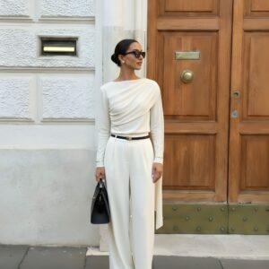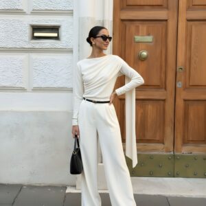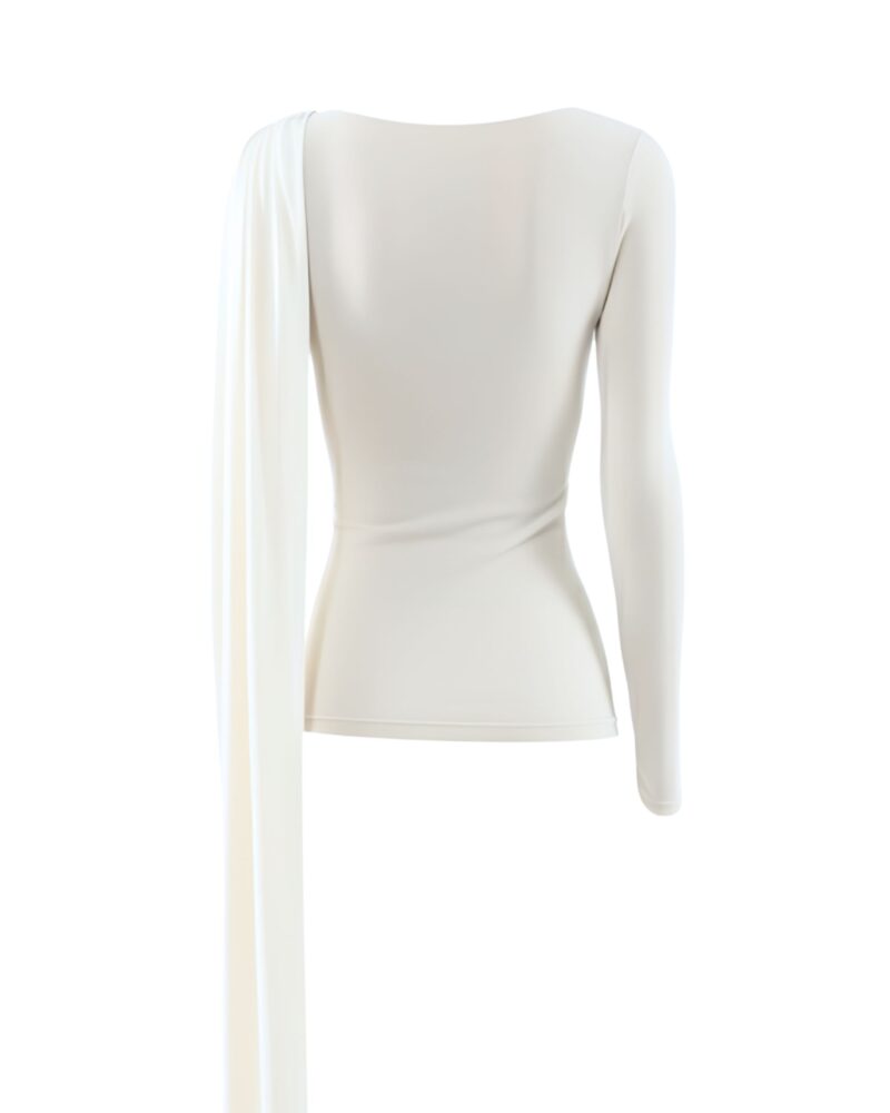 Elegancka, miękko układająca się bluzka z dzianiny z naturalnego jedwabiu. Asymetryczne drapowanie od ramienia modeluje linię biustu i talii, a długi, opadający panel nadaje stylizacji biżuteryjny charakter. Smukła sylwetka, gładkie wykończenie i subtelny połysk jedwabiu sprawiają, że to idealny top na dzień i wieczór.