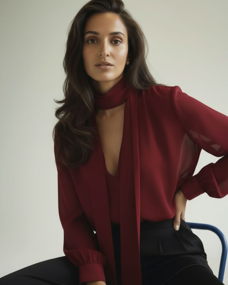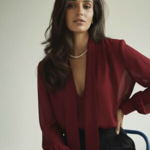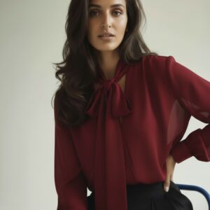 Bluzka z jedwabnej krepy o matowym wykończeniu, idealna na eleganckie i casualowe stylizacje. Wykonana z wysokiej jakości jedwabiu, który zapewnia komfort noszenia, lekkość i przewiewność. Posiada dekolt w kształcie litery V oraz długie rękawy z wykończeniem na mankiety. Szeroka szarfa przy szyi pozwala na różne stylizacje – można ją zawiązać na kokardę lub swobodnie pozostawić luźno. Dzięki prostemu, ale efektownemu krojowi, bluzka świetnie komponuje się zarówno z eleganckimi spodniami, jak i jeansami. Doskonała na każdą okazję, od wieczornych wyjść po codzienne stylizacje, które wymagają odrobiny szyku.