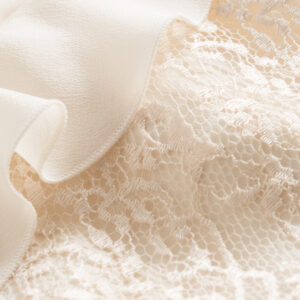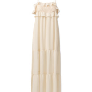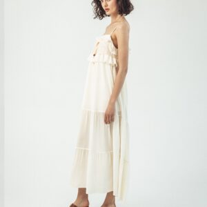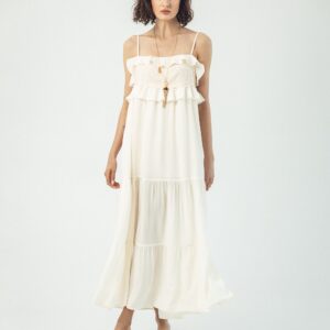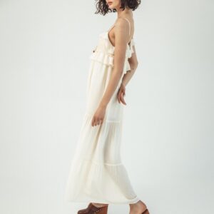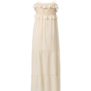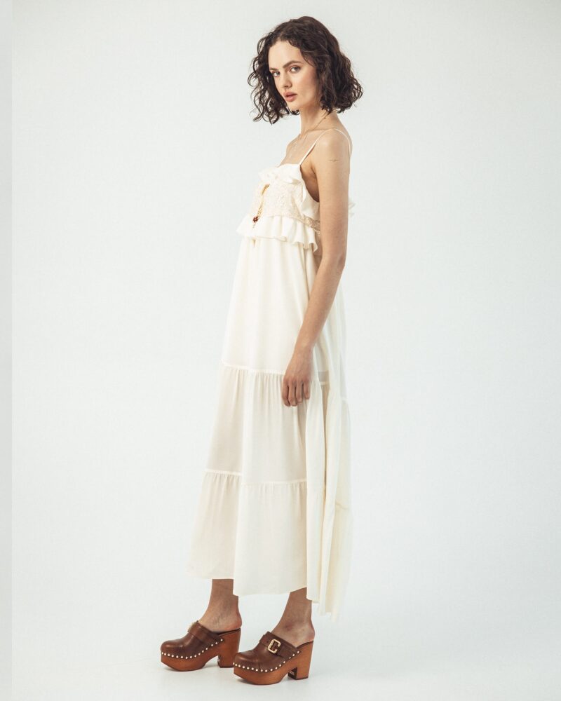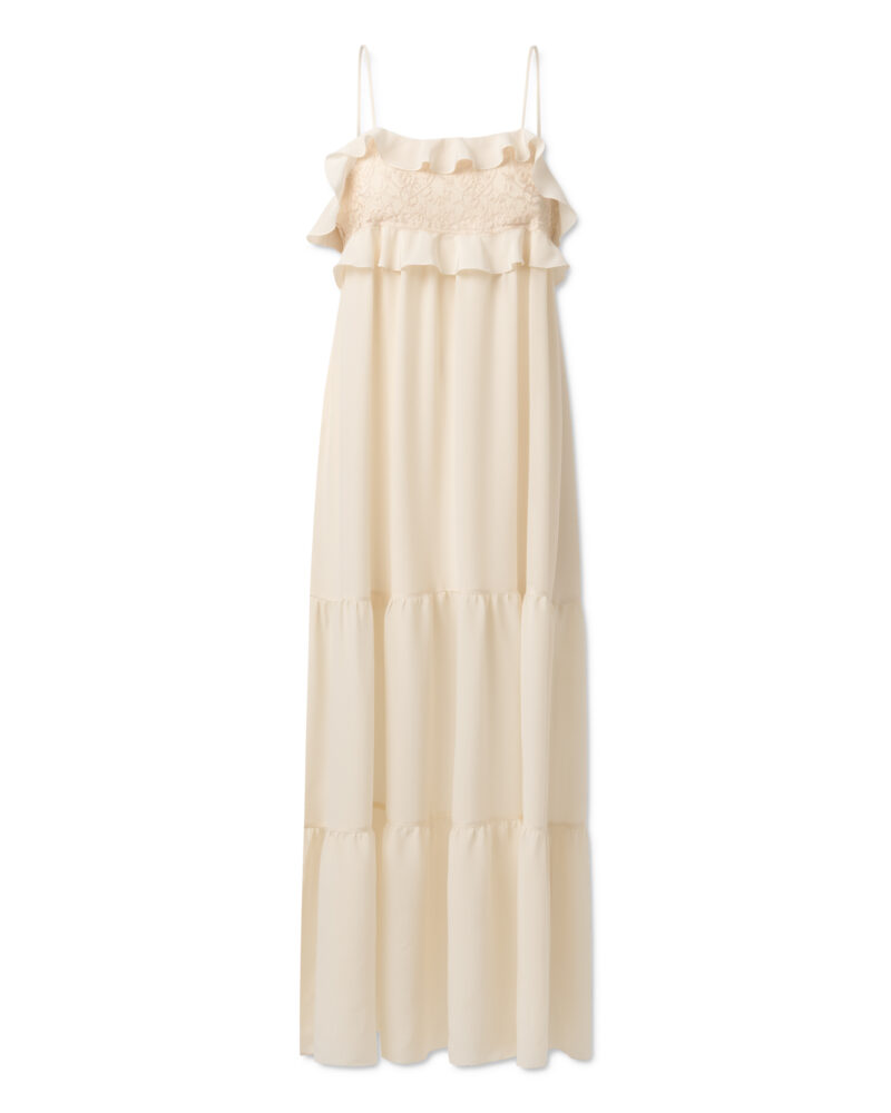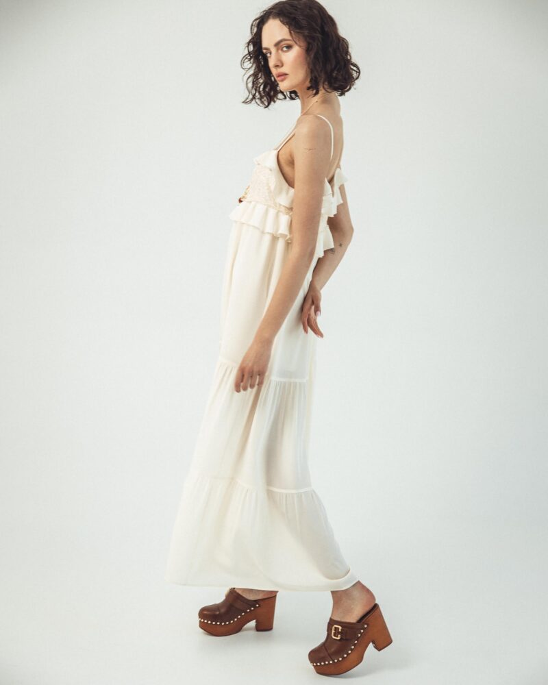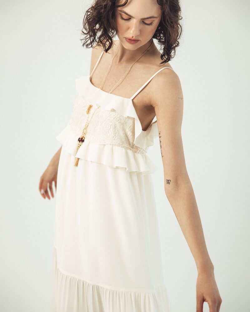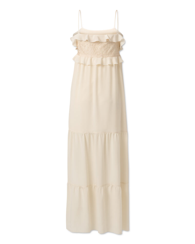 Długa jedwabna sukienka na ramiączkach z koronką i falbanką – Verona