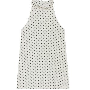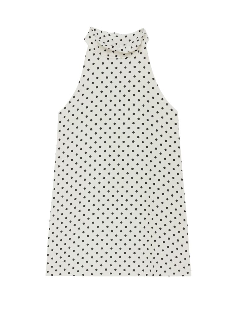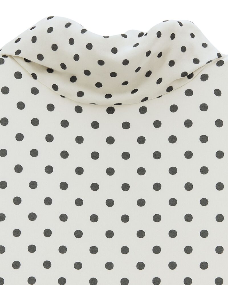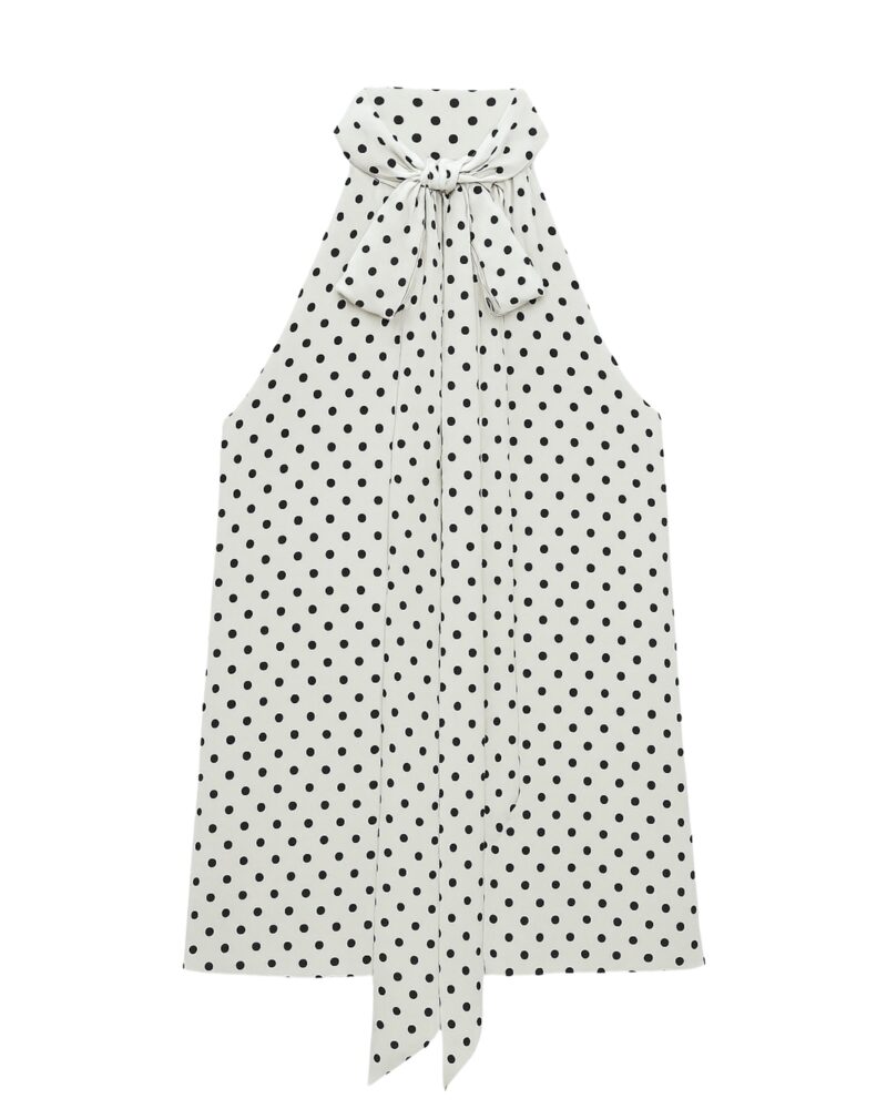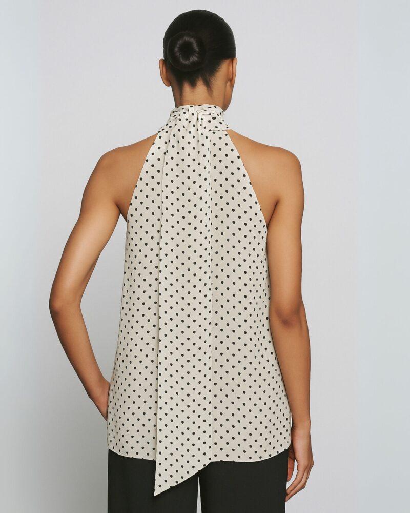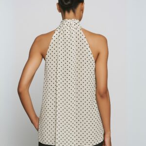 Zachwycająca elegancją i subtelnością bluzka bez rękawów uszyta w 100% z jedwabiu – zarówno wierzchnia warstwa, jak i podszewka wykonane zostały z tej luksusowej tkaniny. Delikatny, lekko transparentny szyfon jedwabny nadaje całości lekkości i kobiecego wdzięku, a klasyczny wzór w drobne czarne groszki dodaje ponadczasowego uroku.