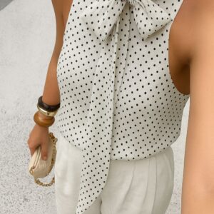 Model z wiązaniem pod szyją dzięki któremu możesz stworzyć efektowną kokardę lub szarfę, nadając stylizacji wyrafinowany charakter. Prosty, lekko rozszerzany fason pięknie układa się na sylwetce, zapewniając komfort i swobodę noszenia.