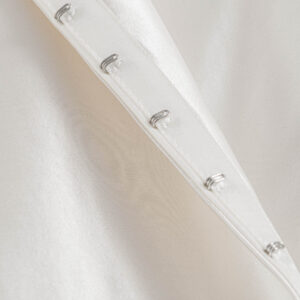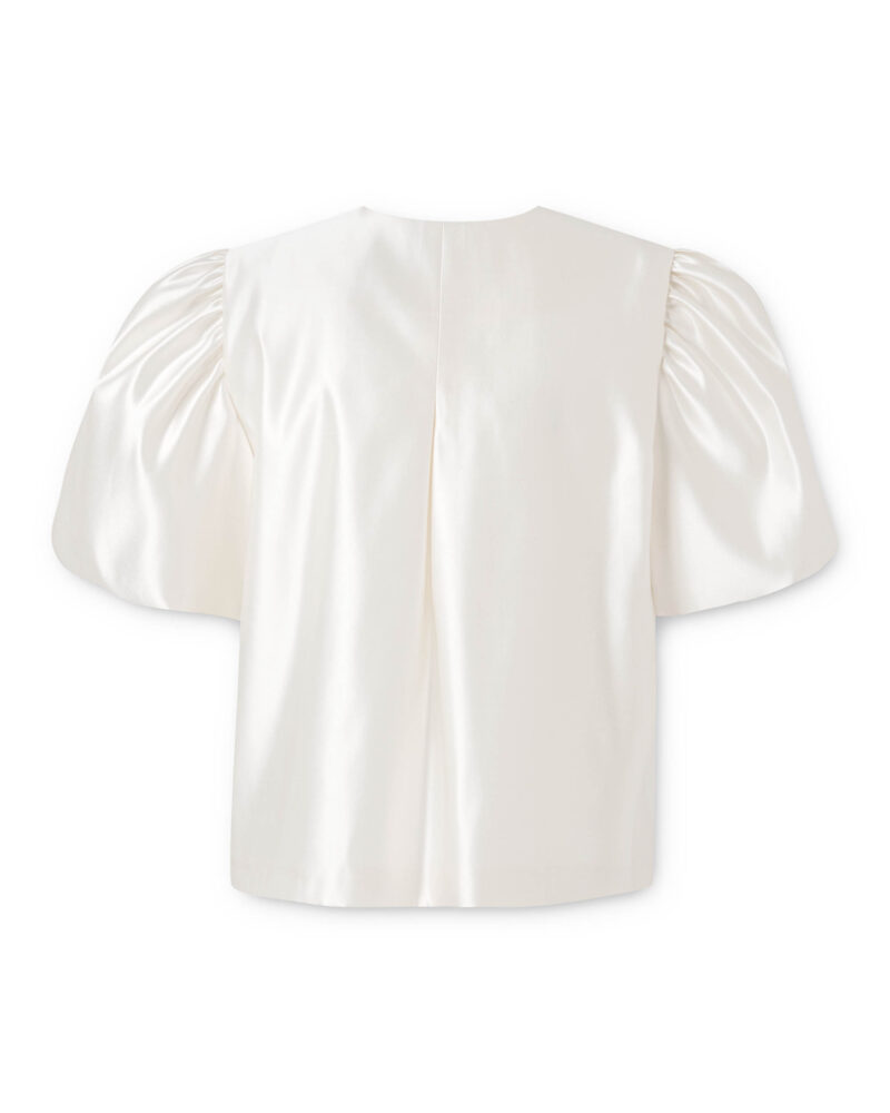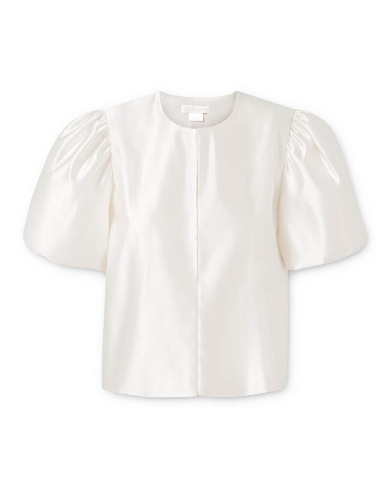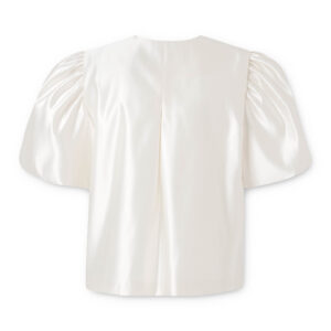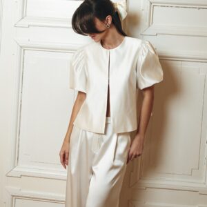 Jedwabna tafta, zastosowana na zewnątrz bluzki, to luksusowa tkanina, która zachwyca swoim eleganckim wyglądem i charakterystycznym, delikatnym połyskiem. Jest to materiał o zwartej strukturze i lekko sztywnym chwycie, który sprawia, że pięknie układa się na sylwetce, tworząc subtelne fałdy i objętość.