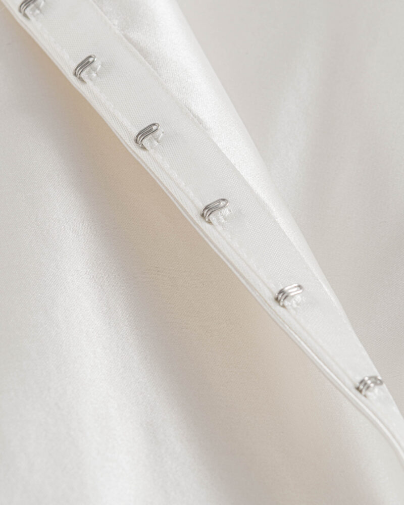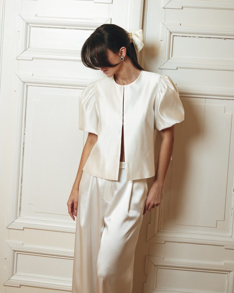 Jedwabna podszewka – wnosi komfort i elegancję, dbając o idealne ułożenie bluzki na sylwetce.