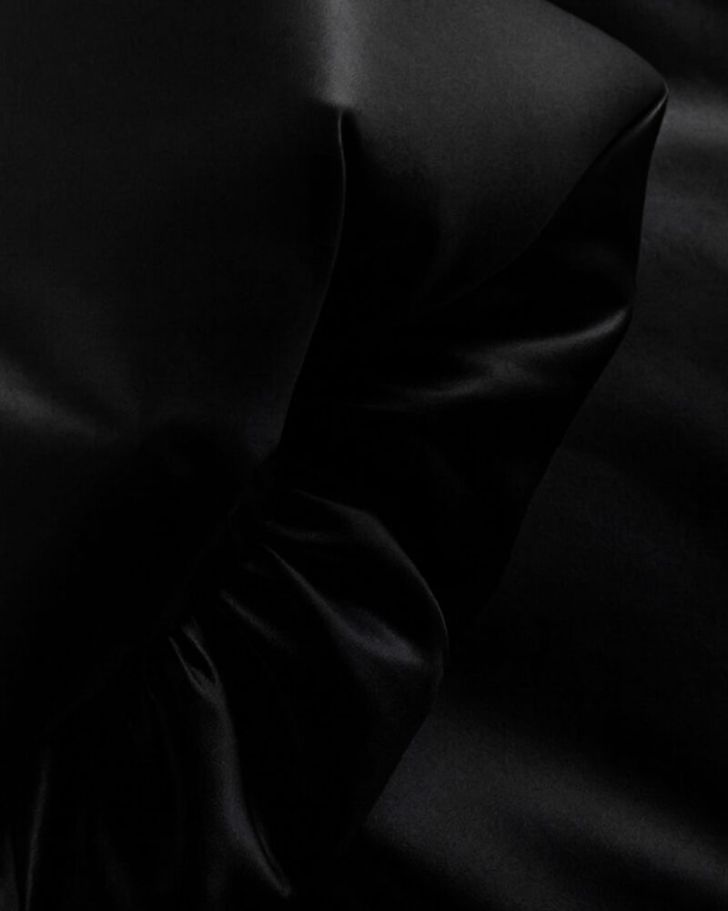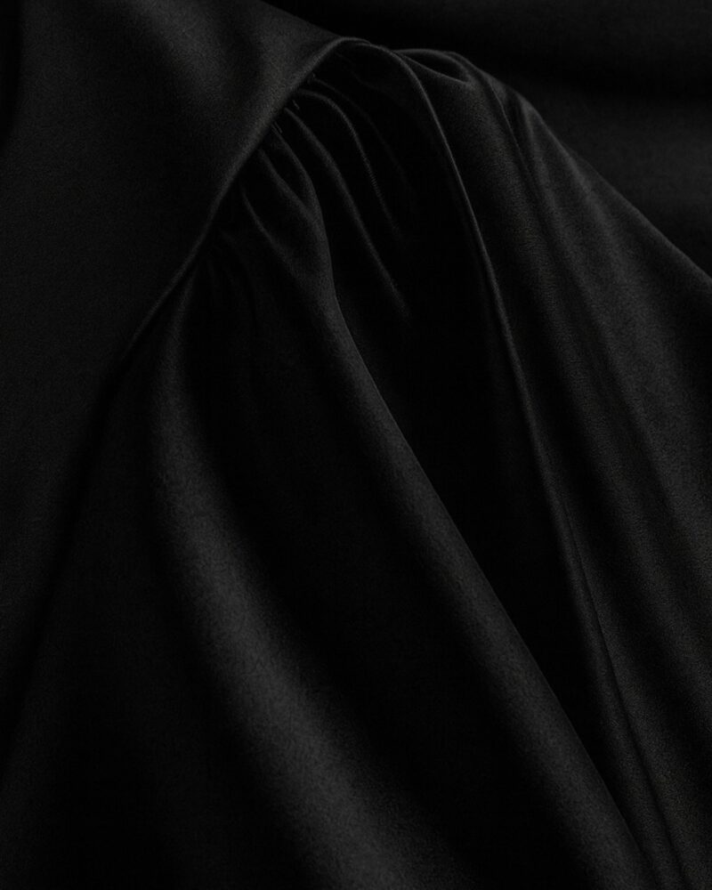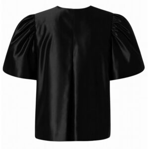 Jedwabna tafta, zastosowana na zewnątrz bluzki, to luksusowa tkanina, która zachwyca swoim eleganckim wyglądem i charakterystycznym, delikatnym połyskiem. Jest to materiał o zwartej strukturze i lekko sztywnym chwycie, który sprawia, że pięknie układa się na sylwetce, tworząc subtelne fałdy i objętość.