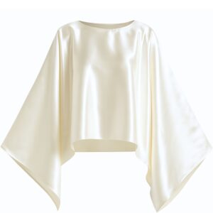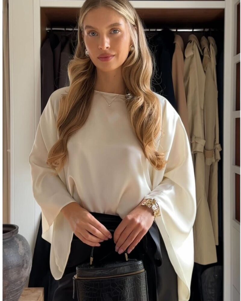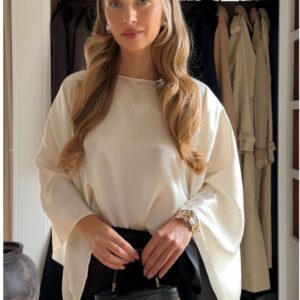 Ta elegancka bluzka wykonana z jedwabnej satyny to kwintesencja luksusowego stylu. Charakteryzuje się subtelnym połyskiem, który dodaje jej niepowtarzalnego blasku. Jej luźny krój oraz szerokie rękawy nadają jej lekkości i swobody, tworząc efektowną, ale jednocześnie wygodną sylwetkę. Bluzka doskonale sprawdzi się zarówno w formalnych, jak i bardziej casualowych stylizacjach, dodając im elegancji. Jej minimalistyczny design i naturalny, ecru kolor pozwalają na łatwe łączenie z różnymi elementami garderoby, od jeansów po eleganckie spódnice, stanowiąc wyjątkowy wybór na każdą okazję.