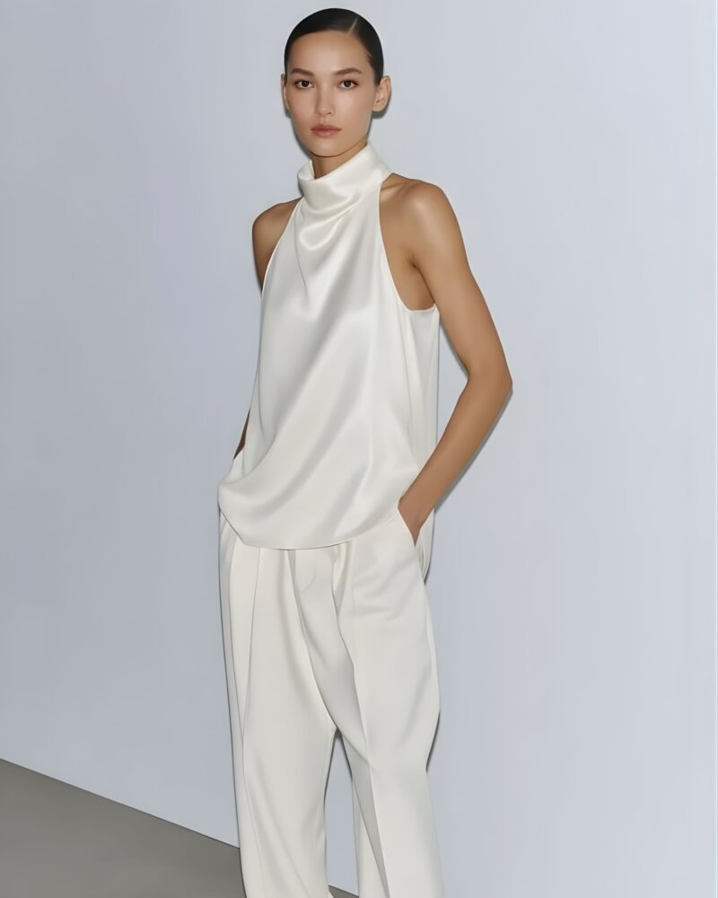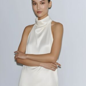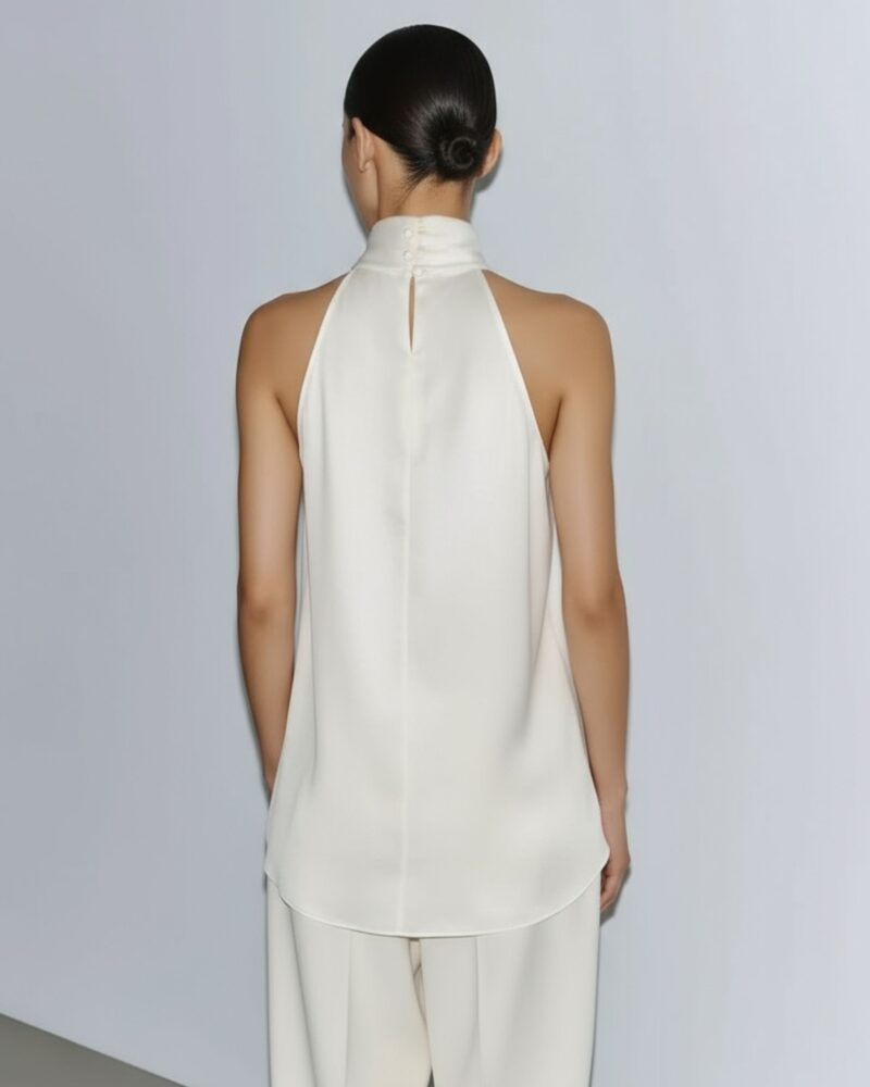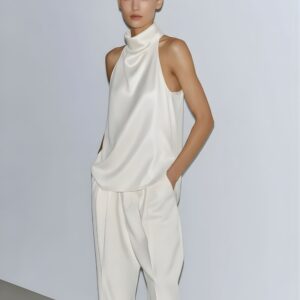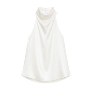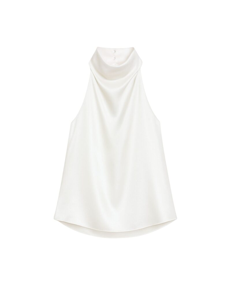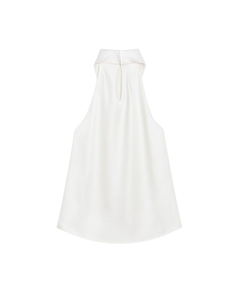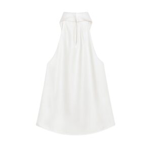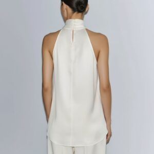 • Starannie skrojony fason – miękko opadający materiał, wyeksponowane ramiona i wyrafinowany, zabudowany dekolt z delikatnym marszczeniem przy szyi.
