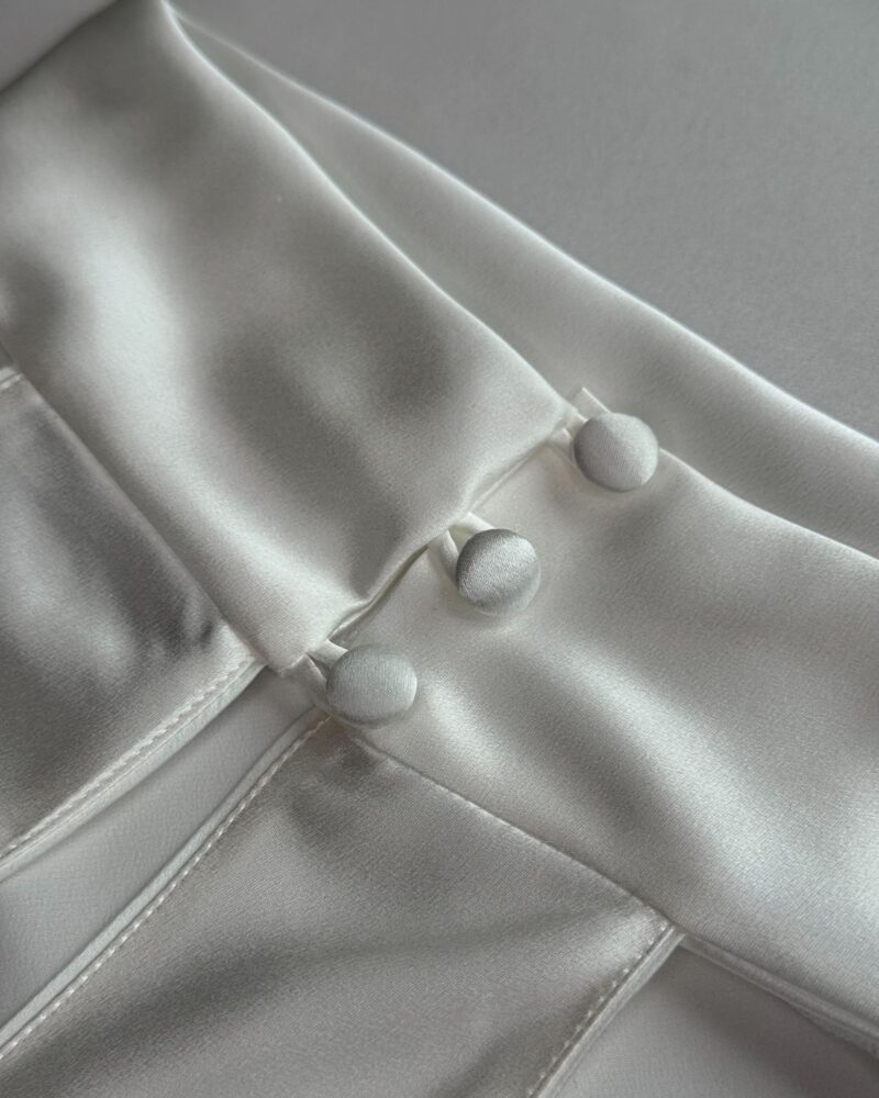 • Luksusowa tkanina – naturalny jedwab satynowy subtelnie odbija światło, tworząc efekt delikatnego blasku, który dodaje szyku każdej stylizacji.