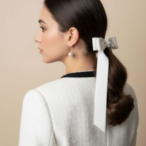 Podkreśl wyjątkowość świątecznych stylizacji dzięki tej jedwabnej kokardzie z perłami, stworzonej dla osób ceniących ponadczasową elegancję. Doskonała zarówno na świąteczne przyjęcia, jak i na wieczorne spotkania, kokarda przyciąga uwagę swoim subtelnym blaskiem pereł, nadając każdej stylizacji klasyczny, paryski szyk.