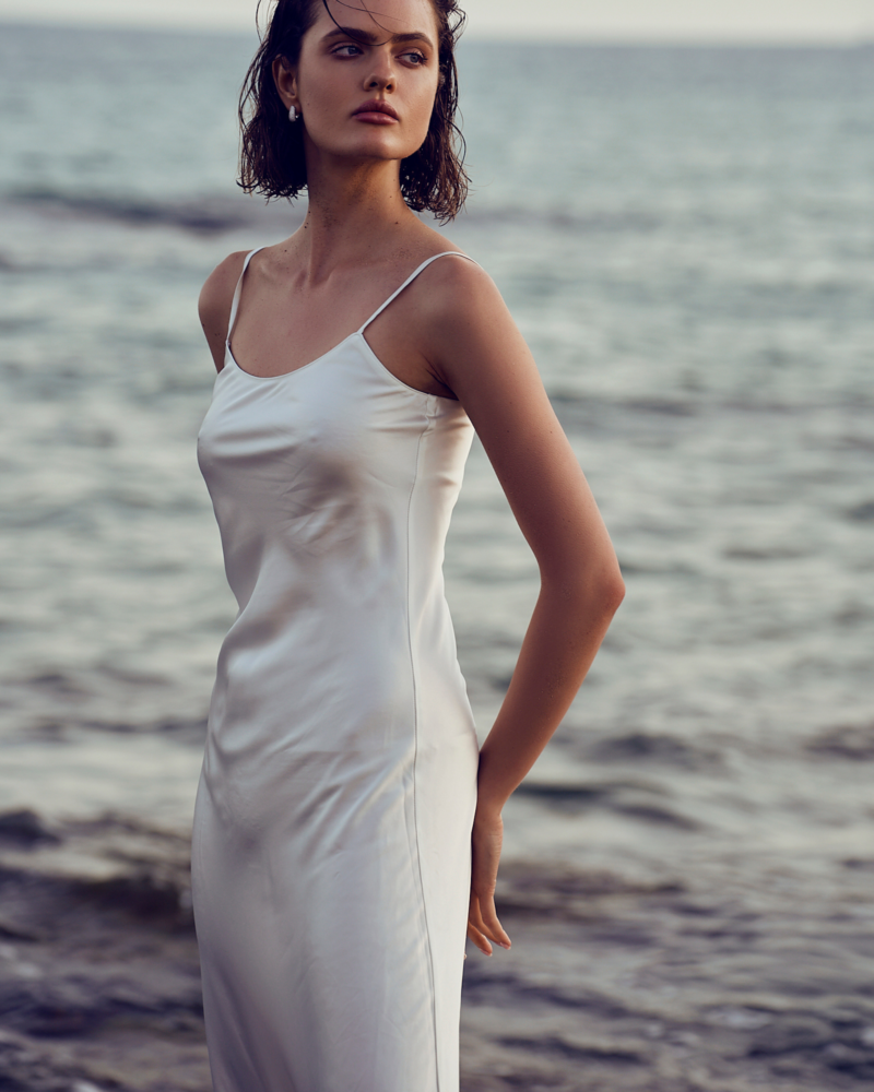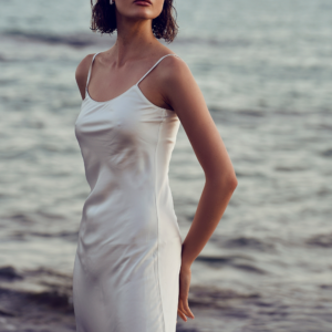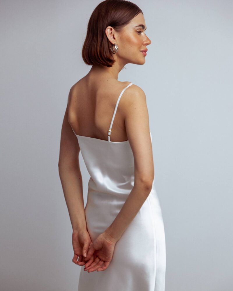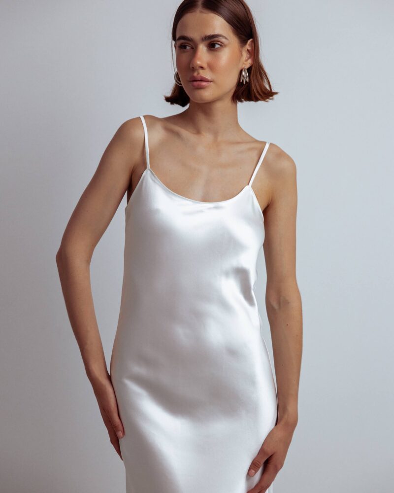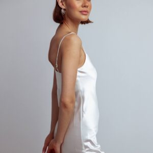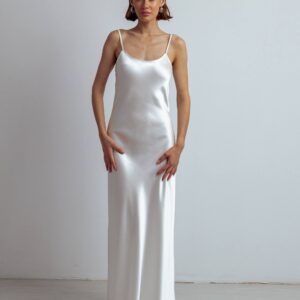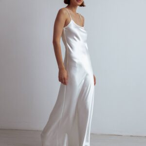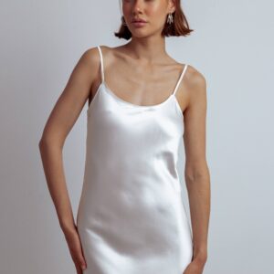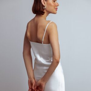 Została odszyta z wysokiej jakości, jedwabiu, skrojonego ze skosu, dzięki czemu pięknie układa się na sylwetce. Delikatne ramiączka pięknie eksponują dekolt.