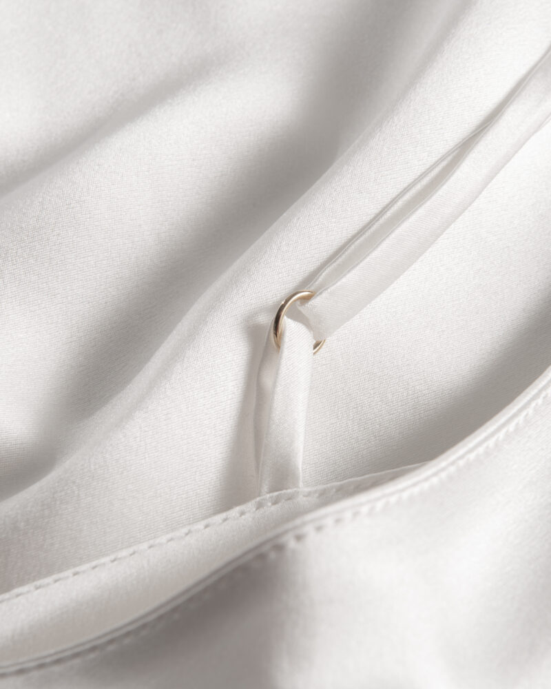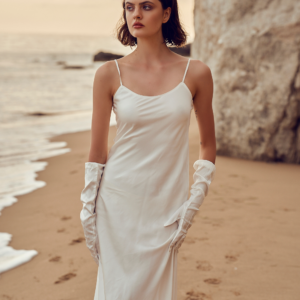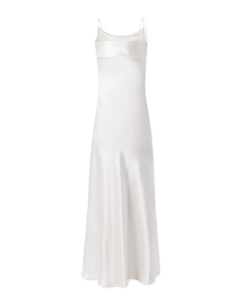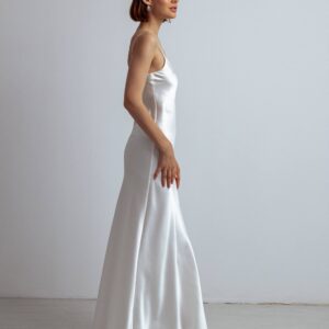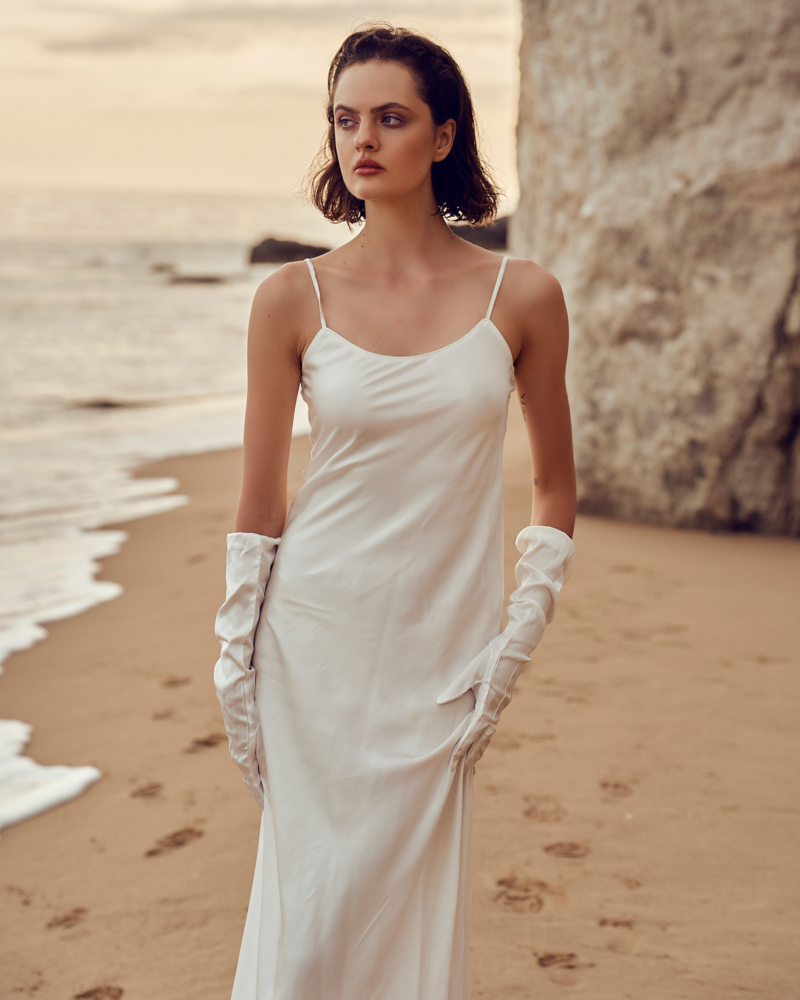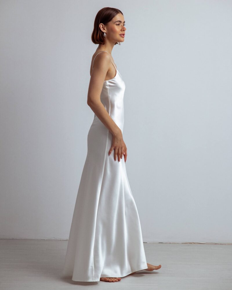 Została odszyta z wysokiej jakości, jedwabiu, skrojonego ze skosu, dzięki czemu pięknie układa się na sylwetce. Delikatne ramiączka pięknie eksponują dekolt.