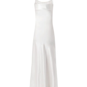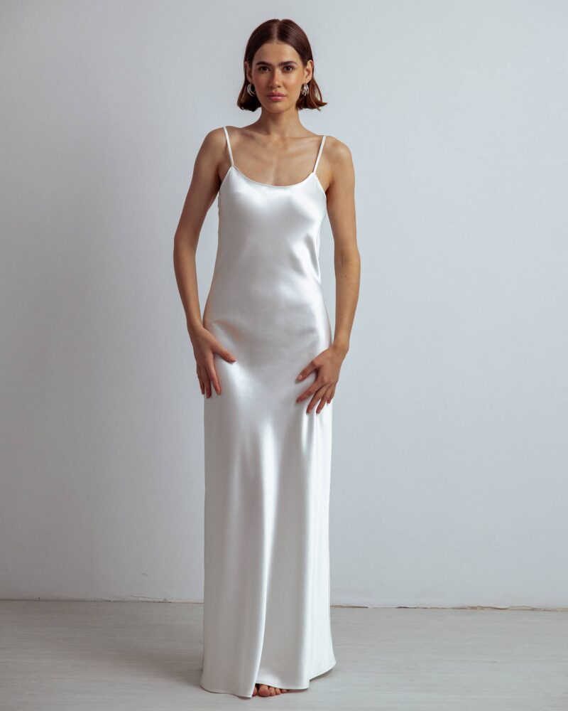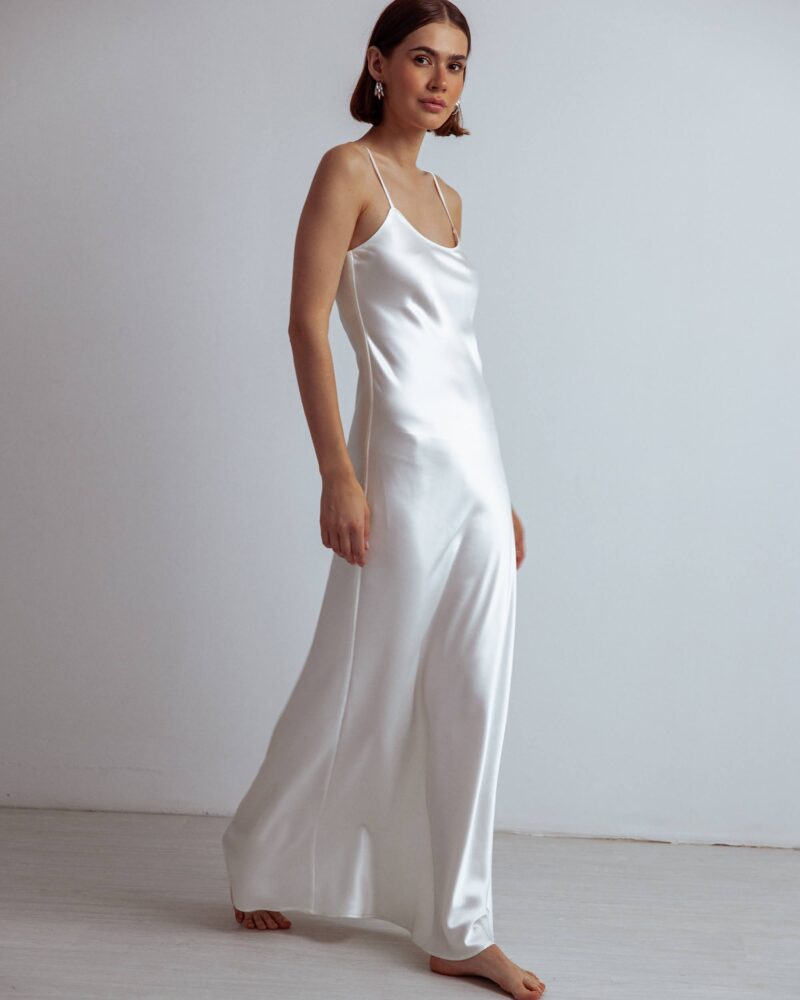Długa, jedwabna sukienka z cienkimi regulowanymi ramiączkami inspirowana bieliźnianymi sukienkami z lat 90.