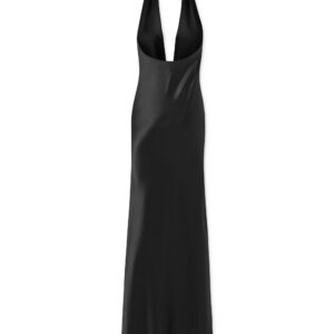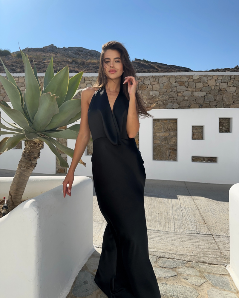 Sukienka charakteryzuje się niezwykle kobiecym dekoltem typu halter, który subtelnie podkreśla ramiona i szyję, dodając sylwetce smukłości. Drapowanie na całej długości sukienki tworzy efektowne i harmonijne linie, które nie tylko przyciągają wzrok, ale także modelują sylwetkę, nadając jej idealne proporcje.