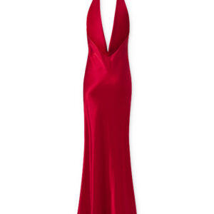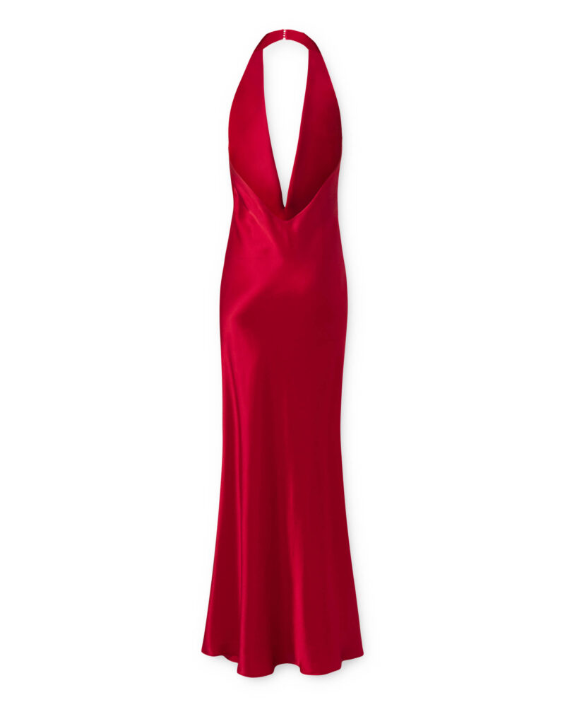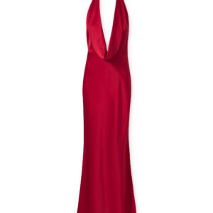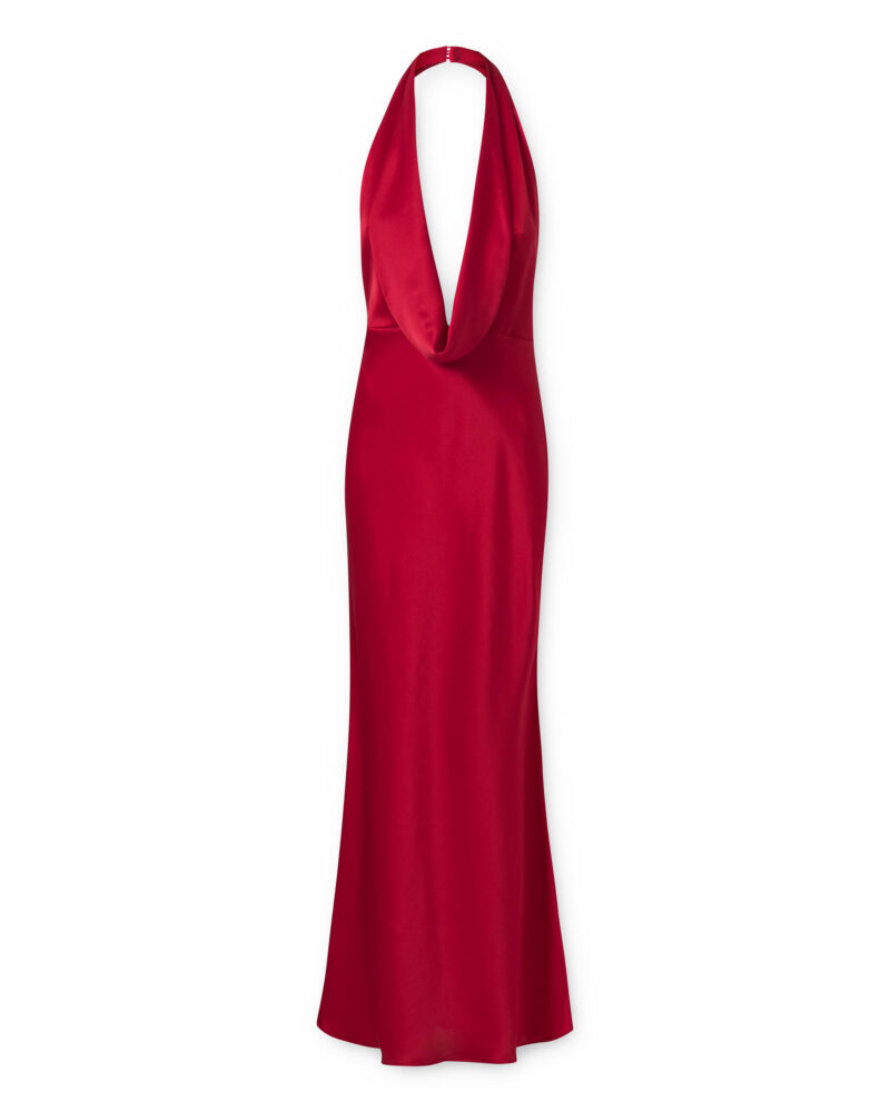 Sukienka charakteryzuje się niezwykle kobiecym dekoltem typu halter, który subtelnie podkreśla ramiona i szyję, dodając sylwetce smukłości. Drapowanie na całej długości sukienki tworzy efektowne i harmonijne linie, które nie tylko przyciągają wzrok, ale także modelują sylwetkę, nadając jej idealne proporcje.