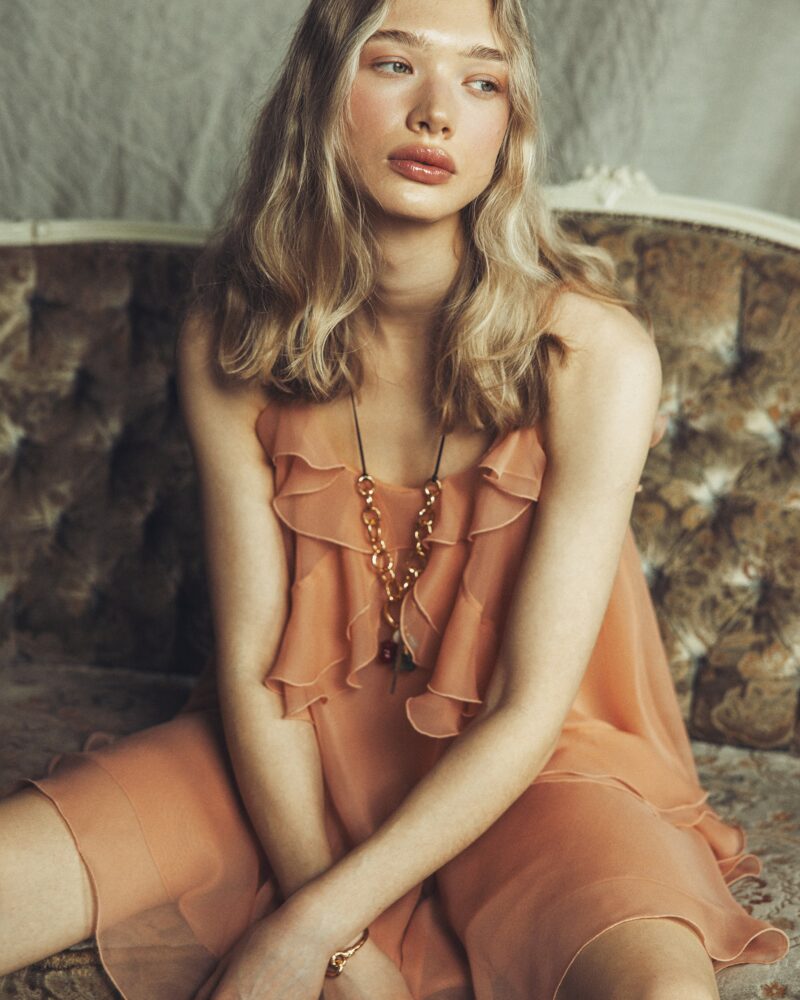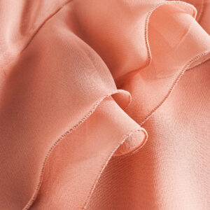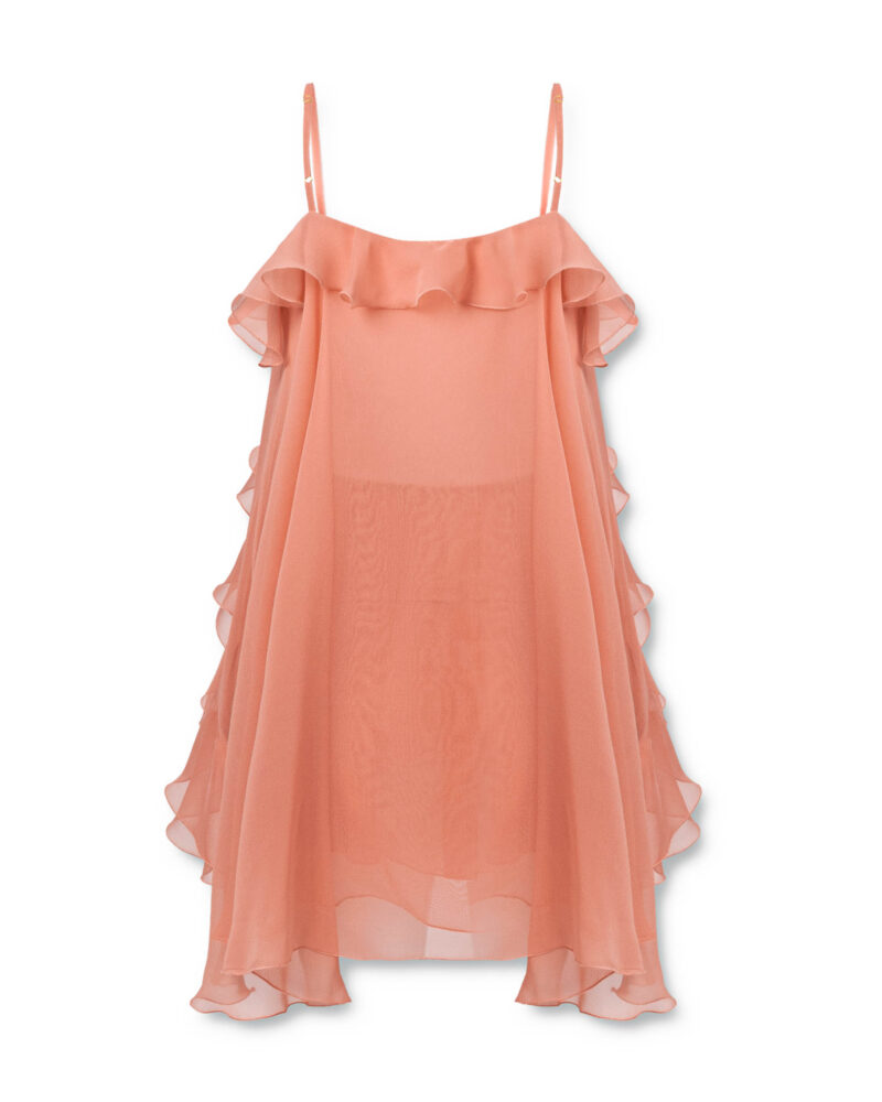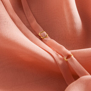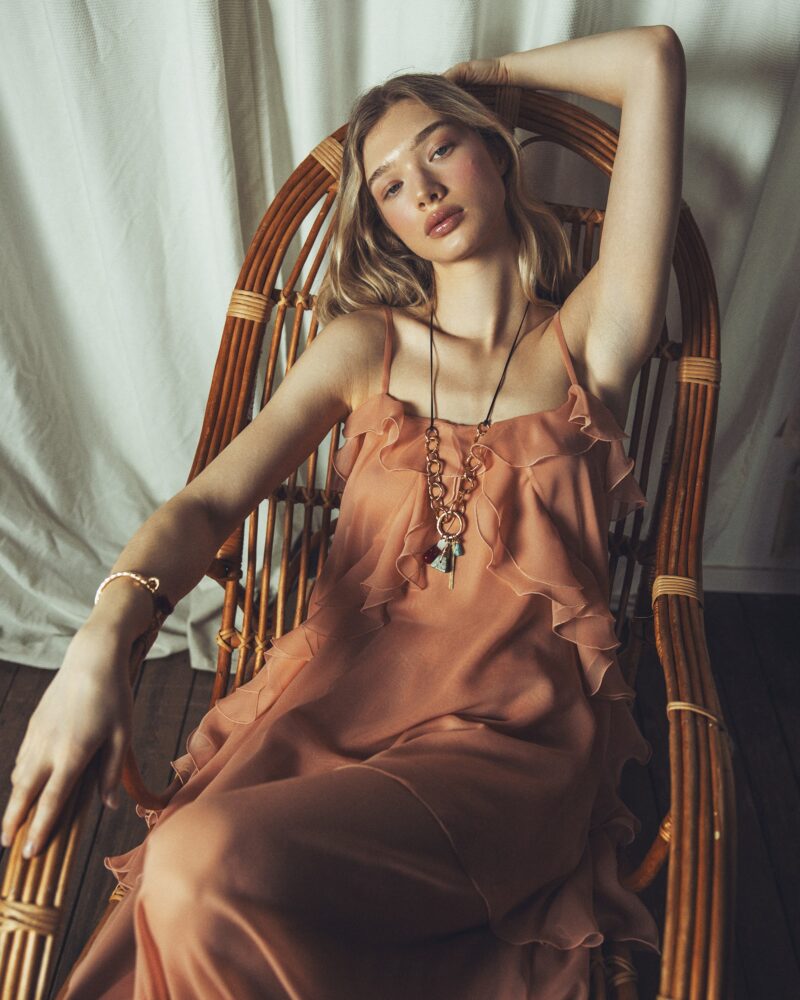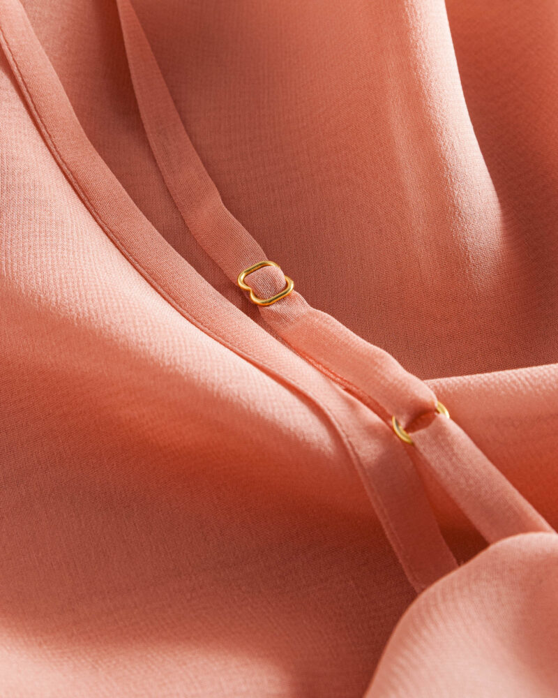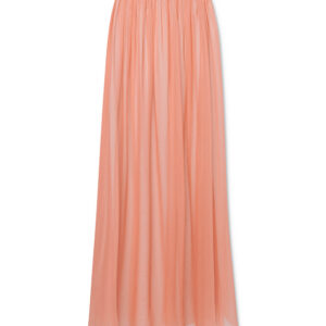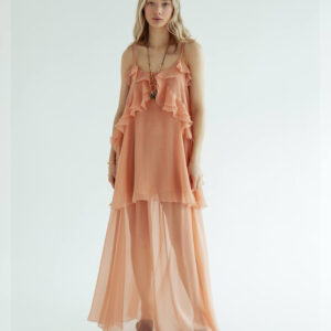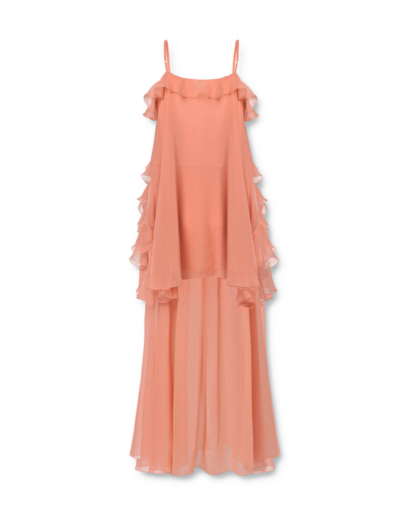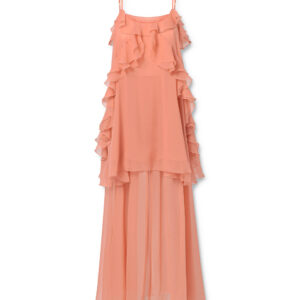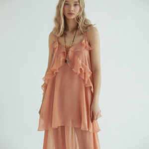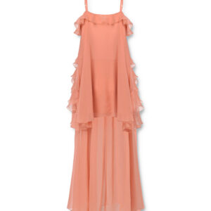 Uszyta z delikatnej, różowej jedwabnej żorżety, zachwyca subtelnością i lekkością. Fale materiału płynnie opadają w dół, tworząc piękną linię sukienki i dodając jej zwiewnego charakteru. Regulowane ramiączka pozwalają na idealne dopasowanie, podkreślając dziewczęcy urok.