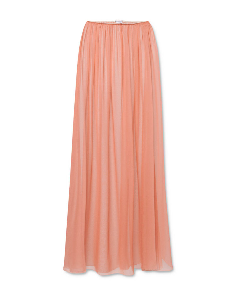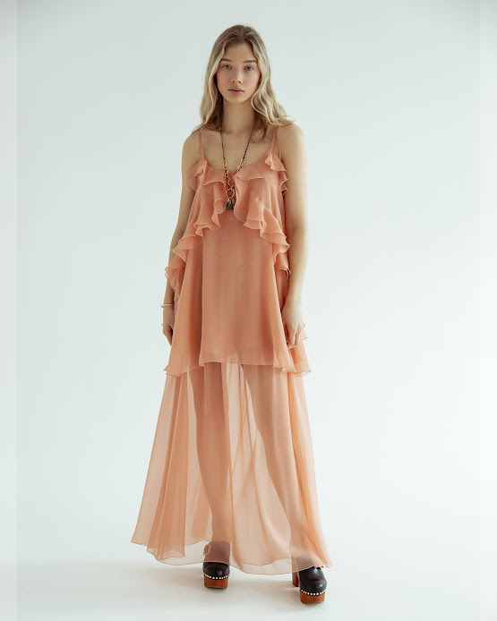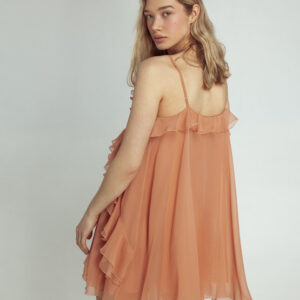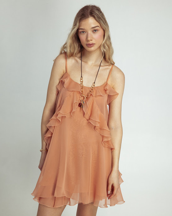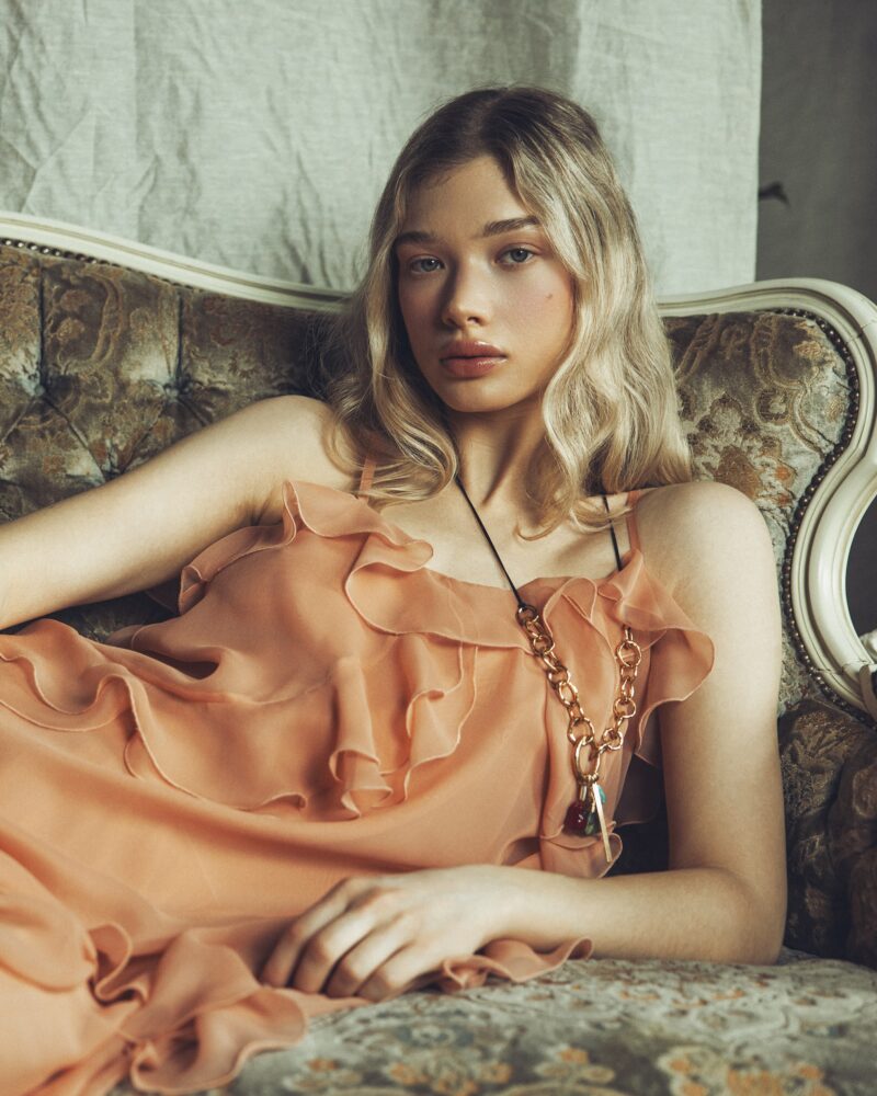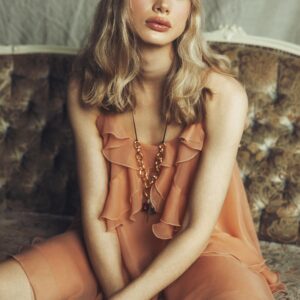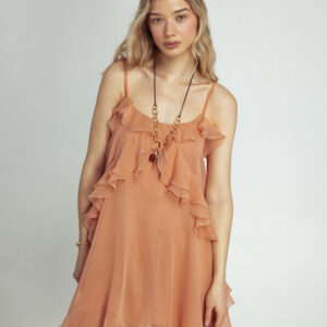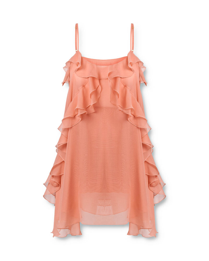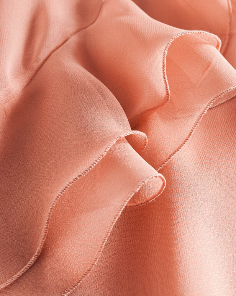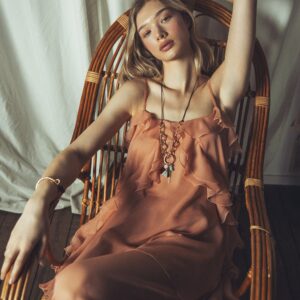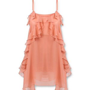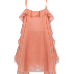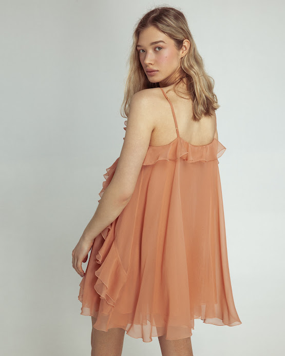 Uszyta z delikatnej, różowej jedwabnej żorżety, zachwyca subtelnością i lekkością. Fale materiału płynnie opadają w dół, tworząc piękną linię sukienki i dodając jej zwiewnego charakteru. Regulowane ramiączka pozwalają na idealne dopasowanie, podkreślając dziewczęcy urok.