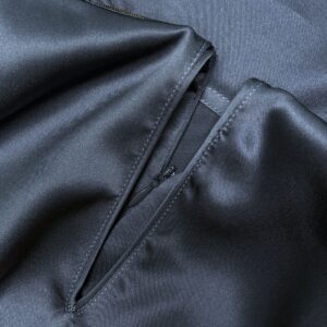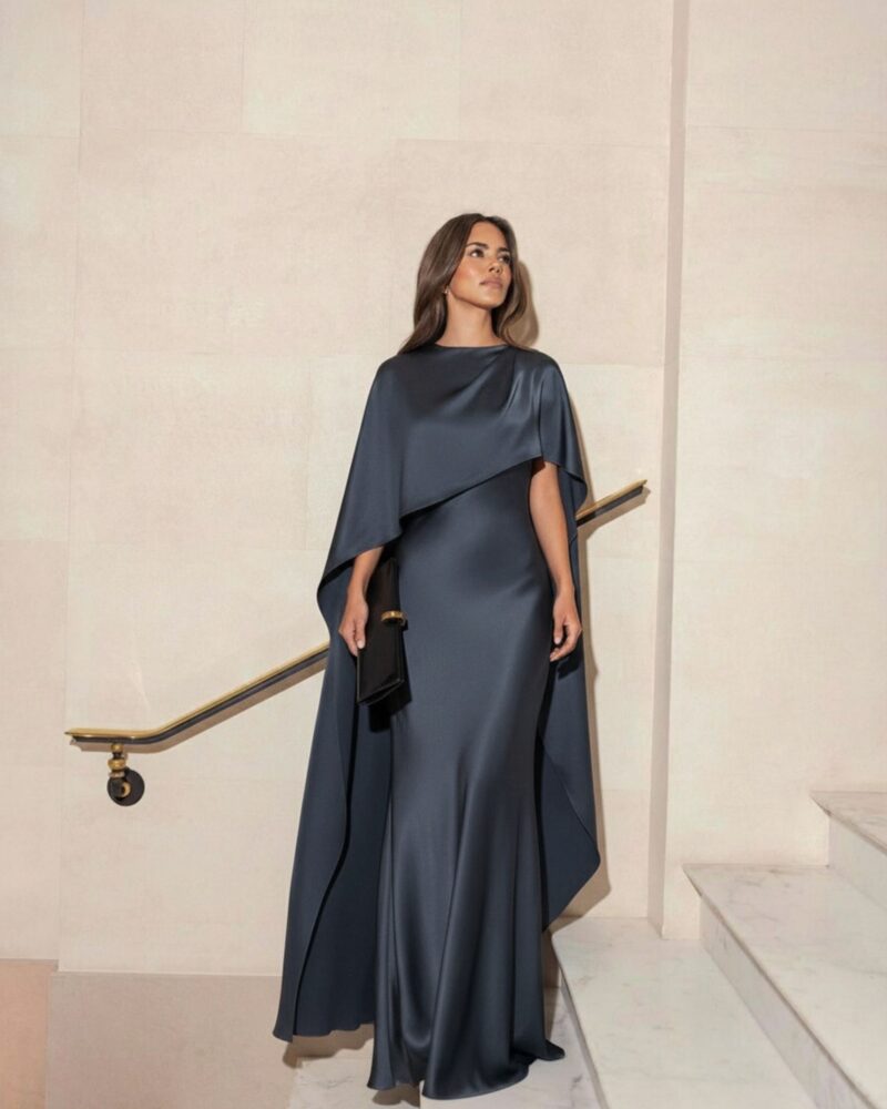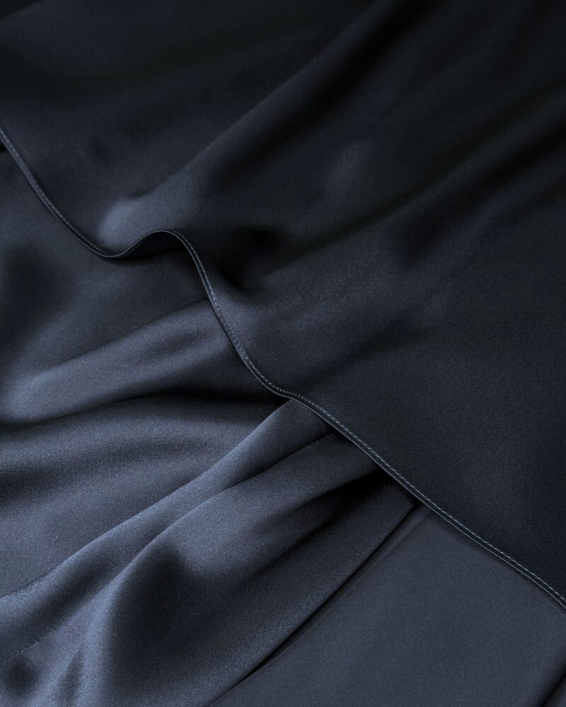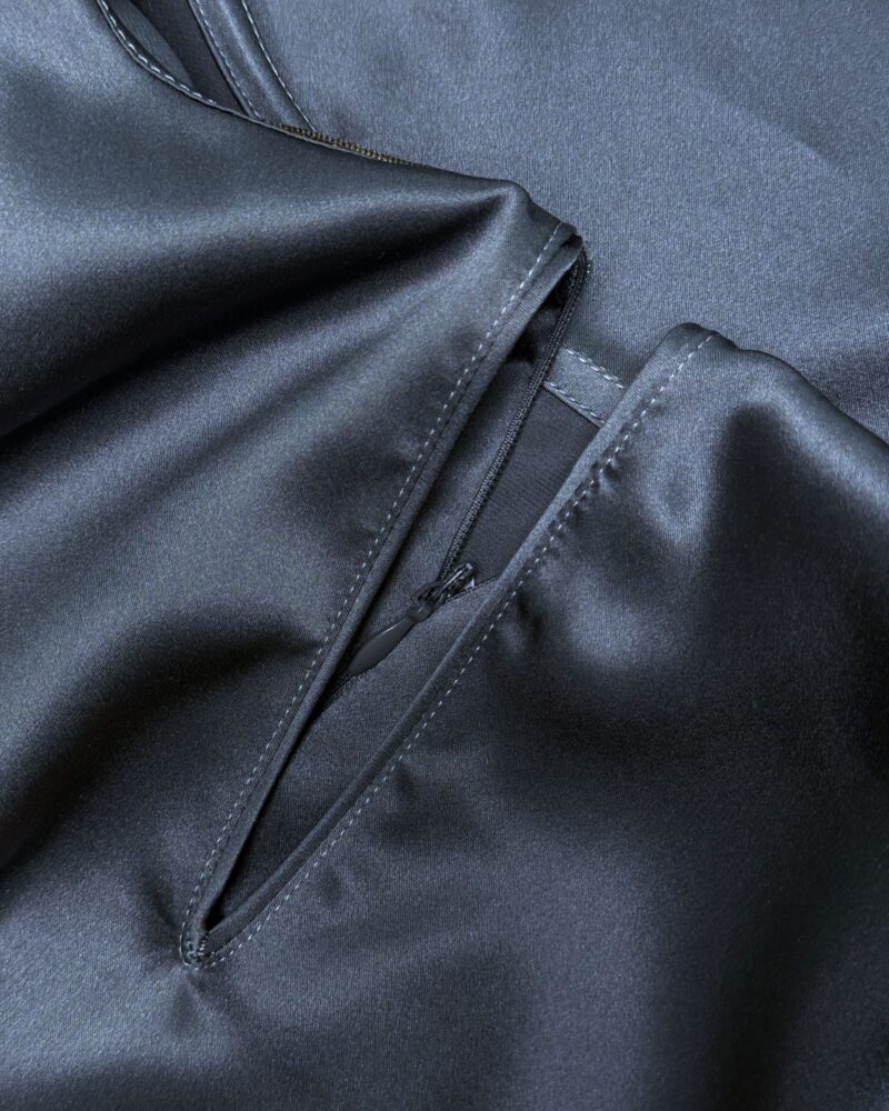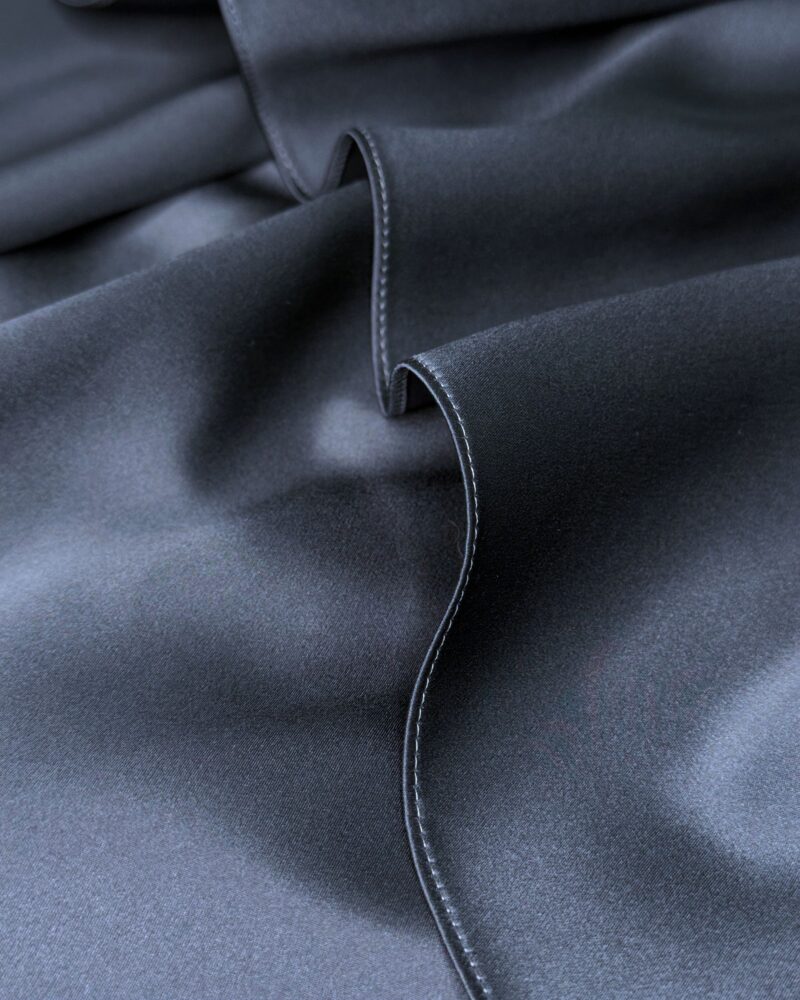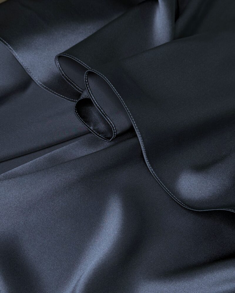 Olśniewająca suknia z najwyższej jakości jedwabiu, stworzona z myślą o wyjątkowych okazjach. Jej luksusowy połysk i miękkość materiału nadają stylizacji niepowtarzalnej elegancji, a głęboki grafitowy kolor podkreśla ponadczasowy charakter kreacji.