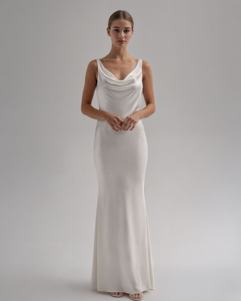 Klasyczna, a zarazem pełna subtelnej zmysłowości – ta jedwabna suknia ślubna została zaprojektowana z myślą o pannach młodych, które cenią ponadczasową elegancję i wyrafinowany minimalizm.