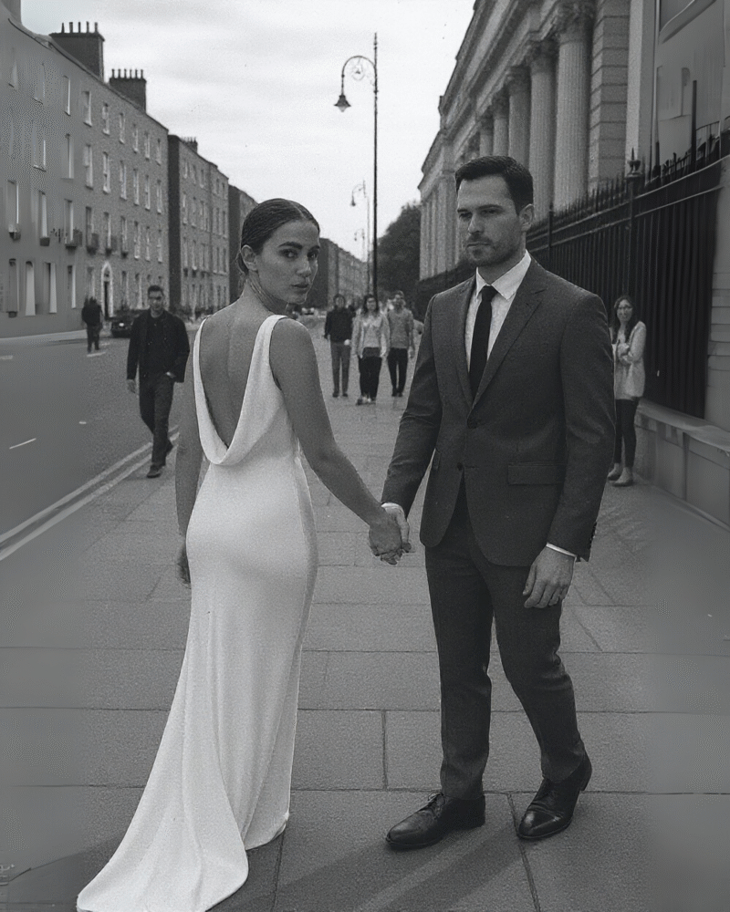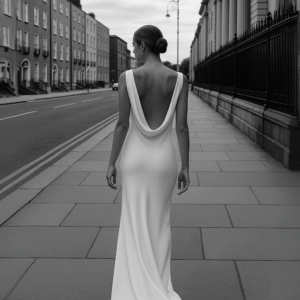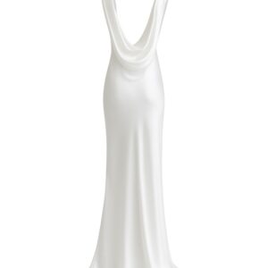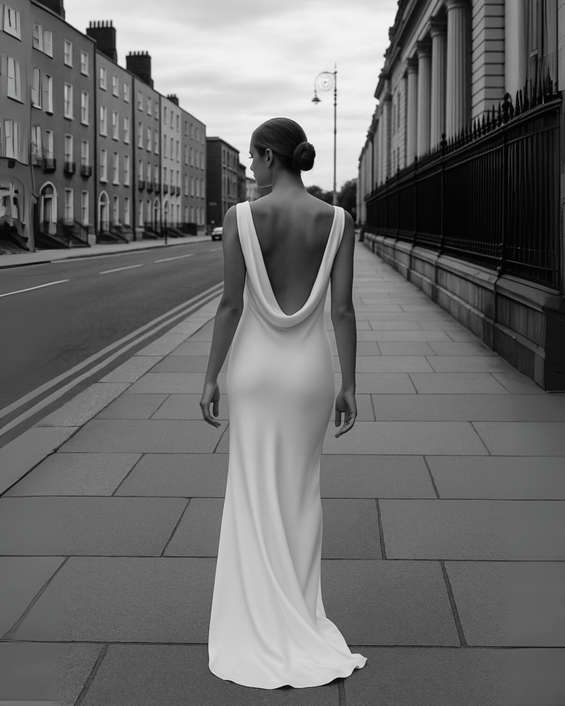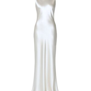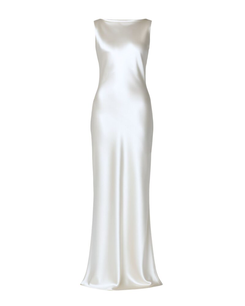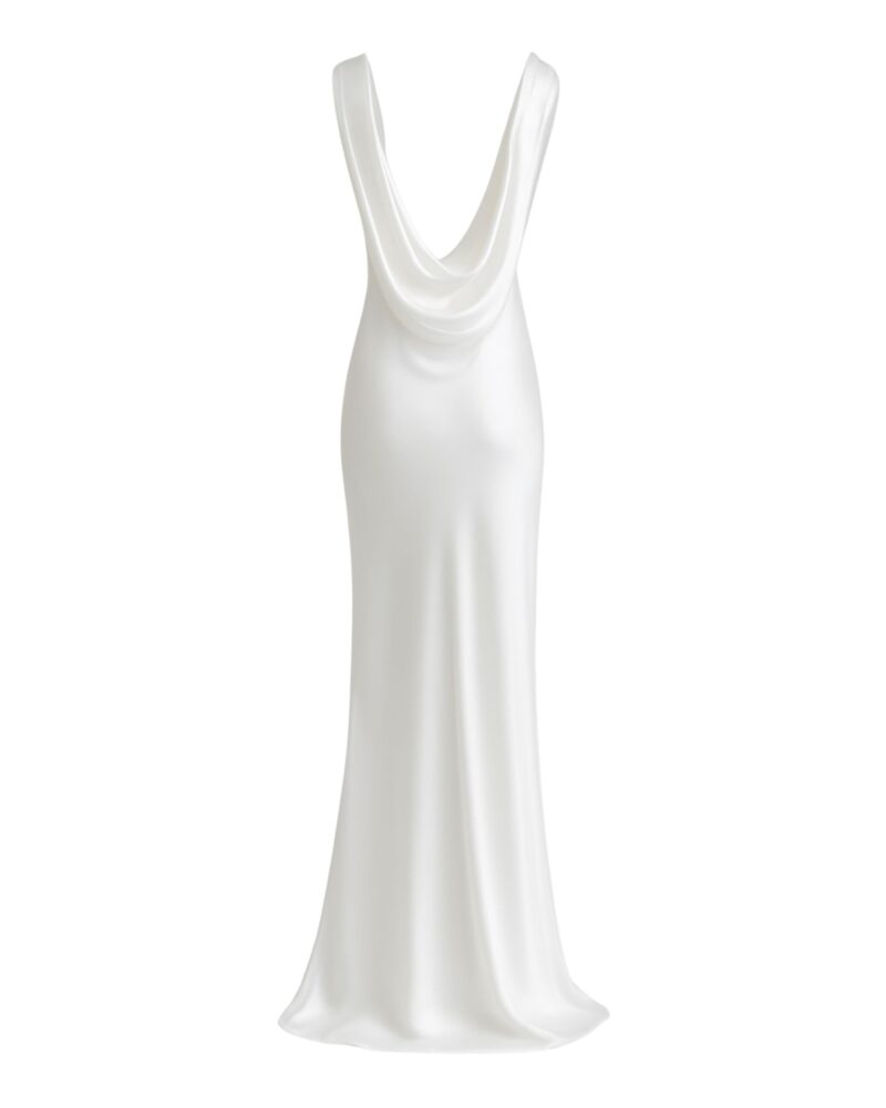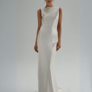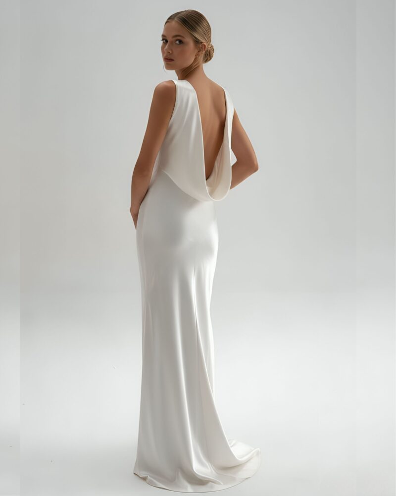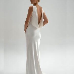 Ta suknia ślubna została uszyta ze 100% najwyższej jakości jedwabiu, którego subtelny połysk nadaje jej wyjątkowego blasku. Smukła linia, lekko opływająca sylwetkę, zakończona delikatnym trenem, podkreśla kobiece kształty, a głęboki dekolt typu cowl na plecach wprowadza element zmysłowości i niepowtarzalnego charakteru.