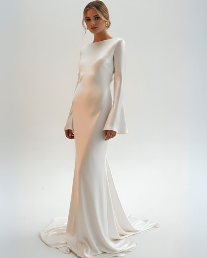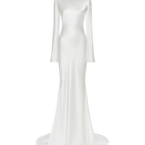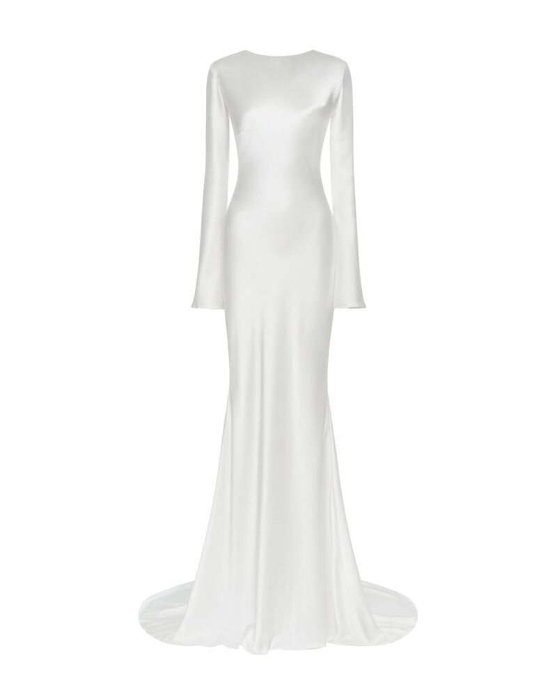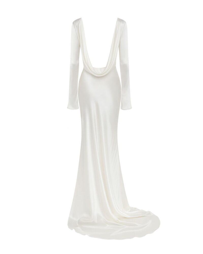 Przód zachwyca minimalistyczną linią z długimi, lekko rozszerzanymi rękawami, natomiast tył odsłania spektakularny dekolt typu cowl, który dodaje kreacji zmysłowości i ponadczasowego uroku. Suknia posiada jedwabną podszewkę i kryty zamek wszyty z boku, co zapewnia wygodę oraz idealne ułożenie na figurze.