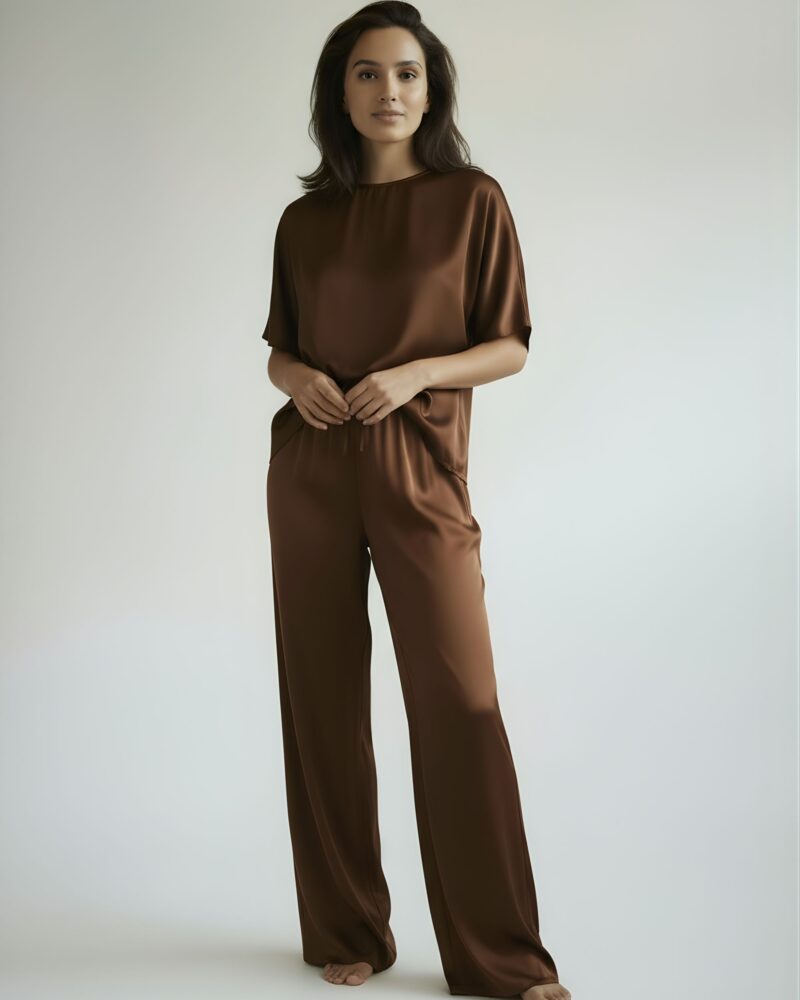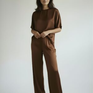 Te eleganckie, jedwabne satynowe spodnie w kolorze bordo to idealne połączenie komfortu i klasy. Wykonane z wysokiej jakości satyny, zapewniają przyjemność noszenia dzięki swojej miękkości i delikatnemu połyskowi. Dzięki szerokiemu krojowi i elastycznemu pasowi z regulowanym sznurkiem, idealnie dopasowują się do sylwetki, oferując swobodę ruchów. Doskonałe na wieczorne wyjścia, eleganckie spotkania, czy casualowe stylizacje, te spodnie będą stanowić niezastąpiony element każdej garderoby. Można je łatwo zestawić z topem lub koszulą na różne okazje.