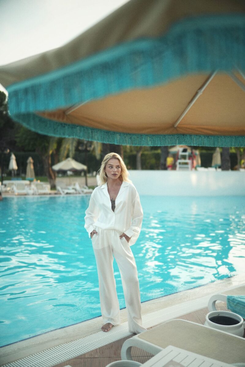 Stylowe, jedwabne spodnie o piżamowym kroju. Wysoki stan, luźne nogawki, szeroka i wygodna guma w pasie, oraz kieszenie. Spodnie tworzą perfekcyjny komplet z koszulą SUNRISE, nawiązując do wciąż modnych stylizacji w piżamowym stylu. Ten set możesz śmiało nosić na co dzień ze swoimi ulubionymi butami – sneakersami lub japonkami. Świetnie sprawdzą się też z prostym, białym t-shirtem lub prążkowanym topem.