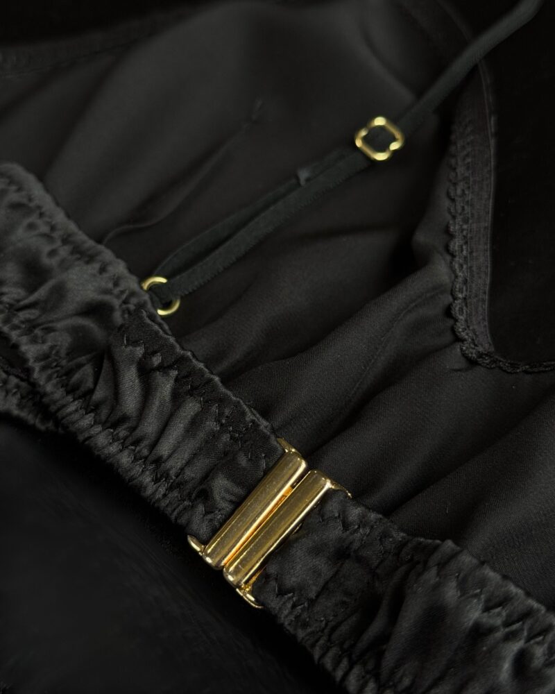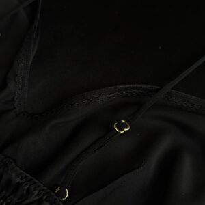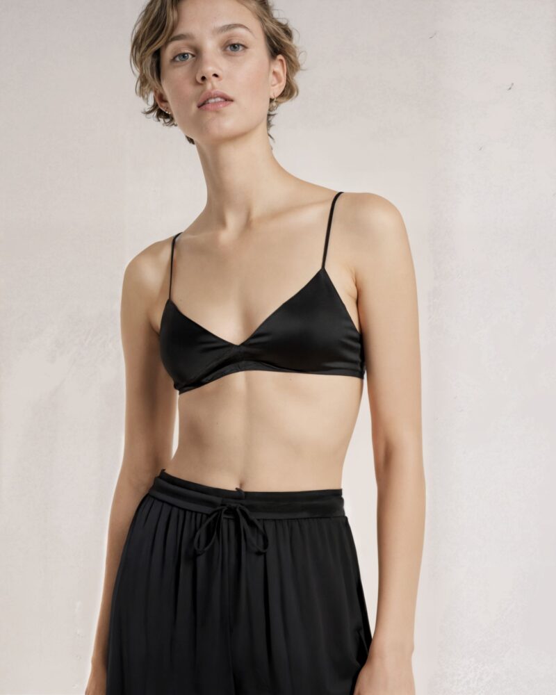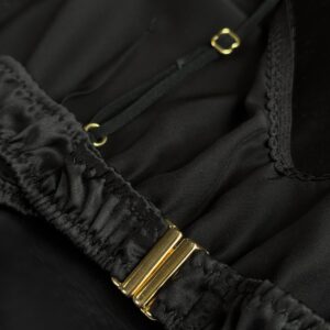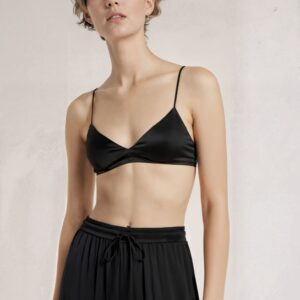 Ten elegancki stanik wykonany jest z delikatnej, jedwabnej satyny, która zapewnia wyjątkowy komfort noszenia i subtelną, luksusową teksturę. Z wąskimi ramiączkami i prostym, minimalistycznym krojem, stanik doskonale dopasowuje się do ciała, podkreślając naturalną linię dekoltu. Wszyte gumki, zapewniają lepsze dopasowanie i komfort noszenia. Staranne wykończenie oraz perfekcyjne szwy gwarantują trwałość, czyniąc go idealnym wyborem na co dzień oraz specjalne okazje.