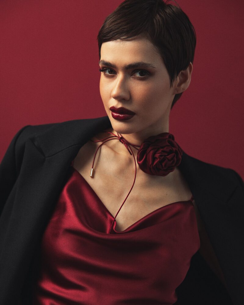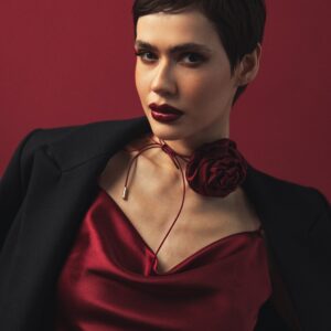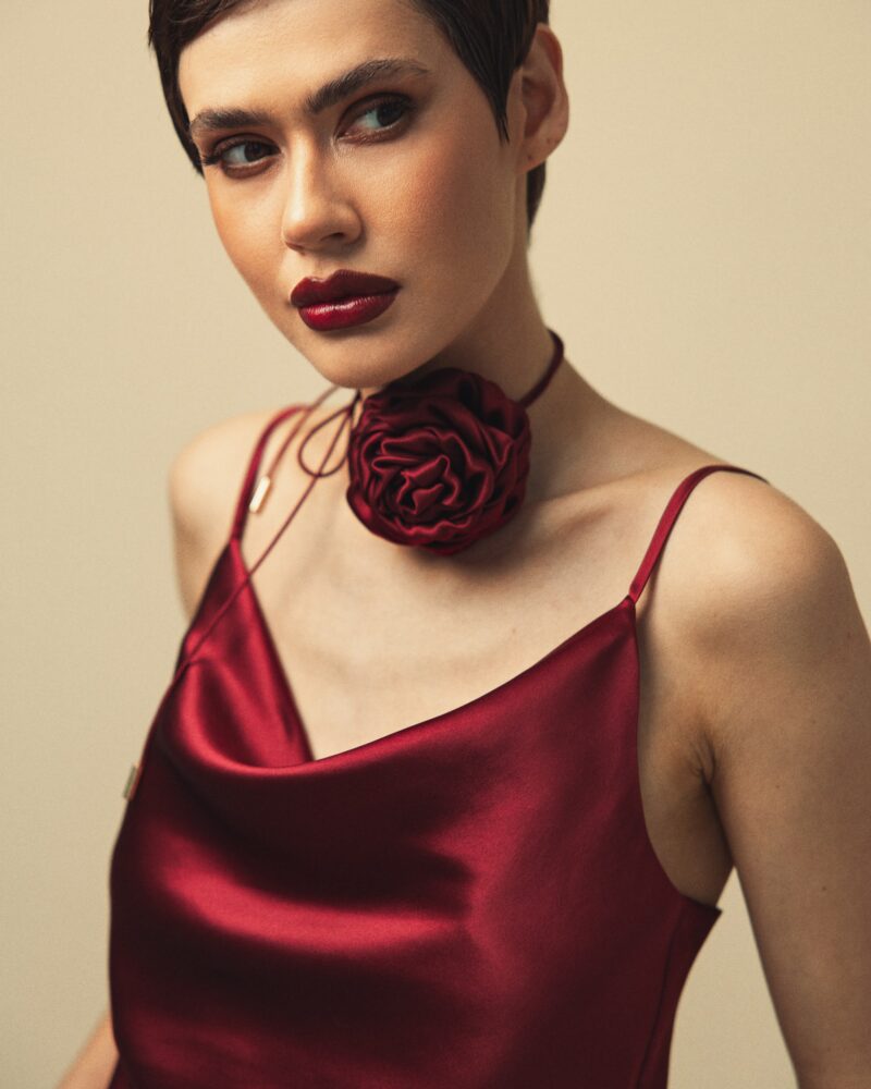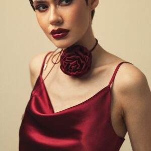 Niezwykle modny dodatek na szyję- choker w formie przepięknej i bardzo efektownej róży. Ręcznie wykonany z najwyższej jakości jedwabiu morwowego. Uzupełni każdy outfit dodając mu modowego charakteru.