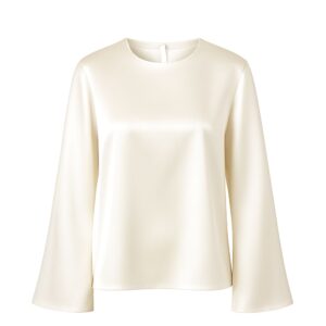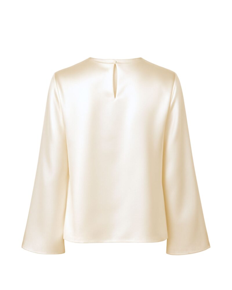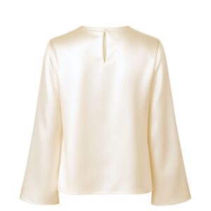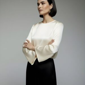 Niezwykle miękka, lekko połyskująca bluzka uszyta w 100% z najwyższej jakości jedwabnej satyny. Luźny, pudełkowy fason subtelnie opływa sylwetkę, a szerokie rękawy dodają nowoczesnej lekkości. Z tyłu delikatne rozcięcie z pętelką i drobniutkim, guziczkiem ułatwia zakładanie, pozostając przy tym dyskretnym detalem.