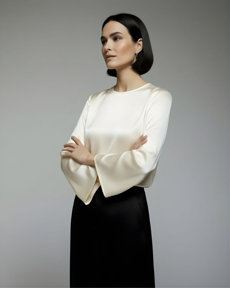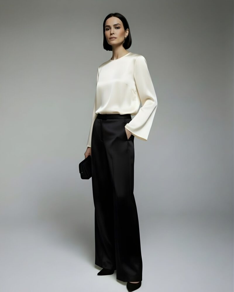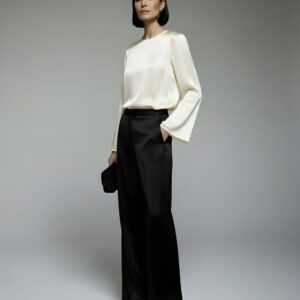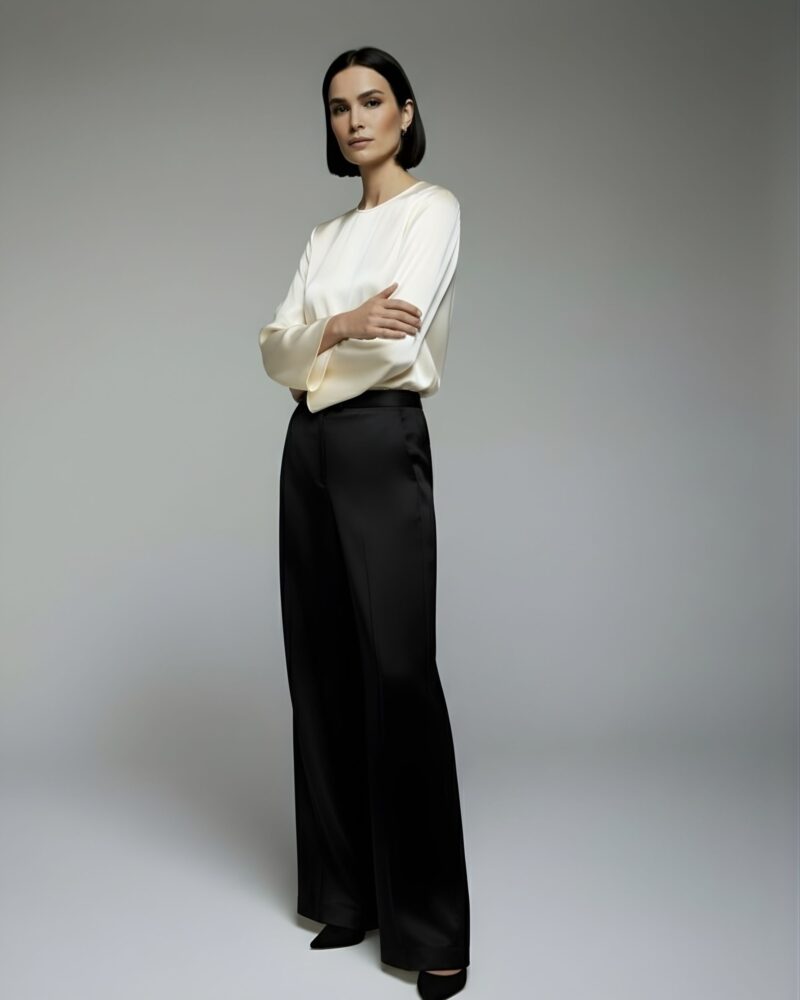 Dodaj do swojej garderoby ponadczasowy model, który łączy luksus jedwabiu z minimalistyczną formą – idealny zarówno do biura, jak i na wyjątkowe wyjścia.