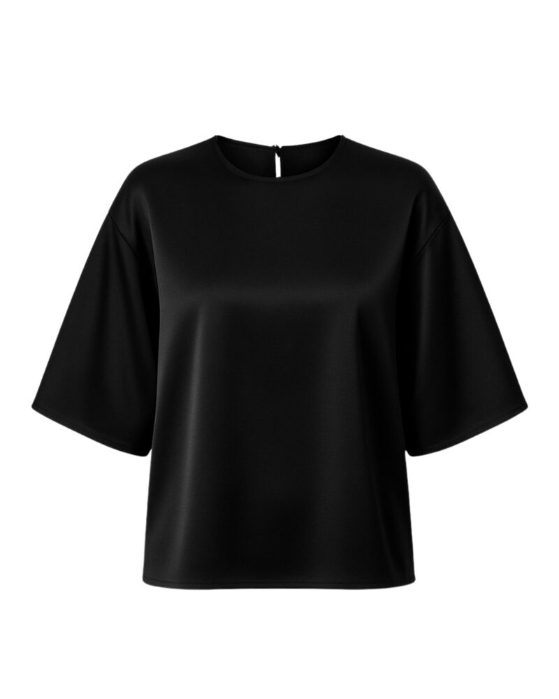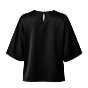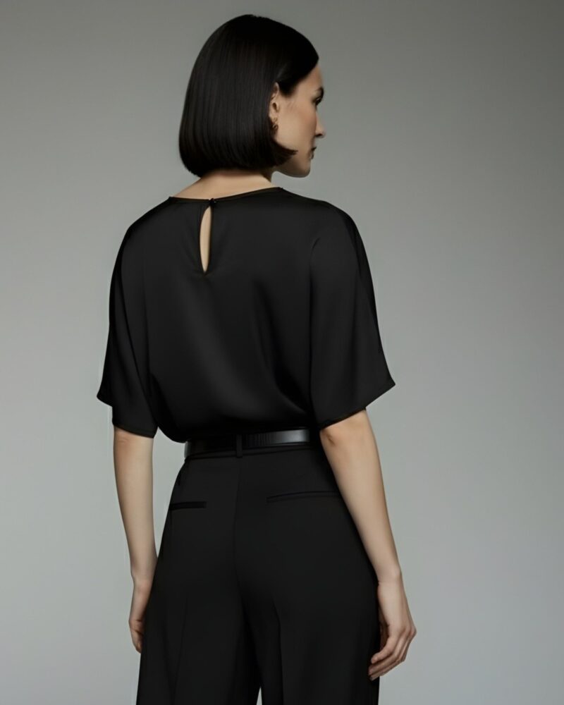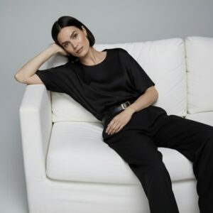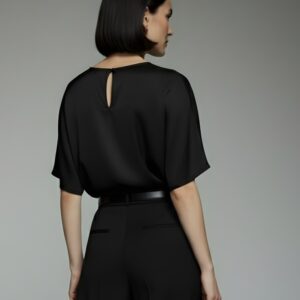 Niezwykle miękka, lekko połyskująca bluzka uszyta w 100% z najwyższej jakości jedwabnej satyny. Luźny, pudełkowy fason subtelnie opływa sylwetkę, a szerokie rękawy do łokcia dodają nowoczesnej lekkości. Z tyłu delikatne rozcięcie z pętelką i drobniutkim, guziczkiem ułatwia zakładanie, pozostając przy tym dyskretnym detalem.