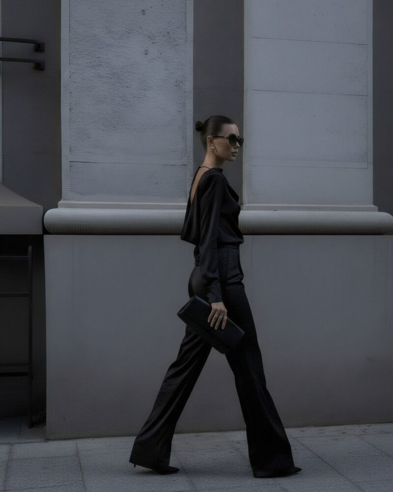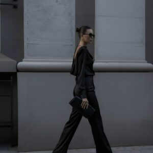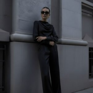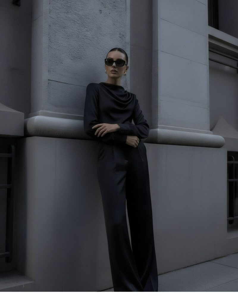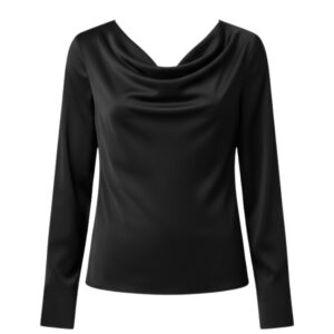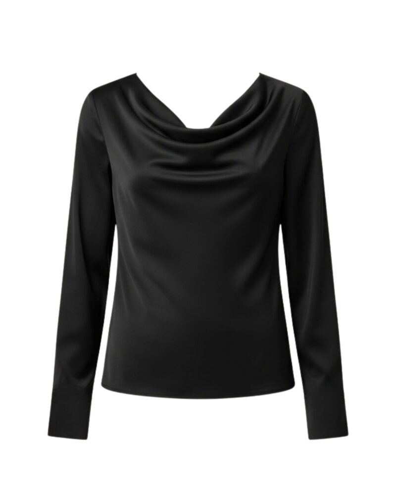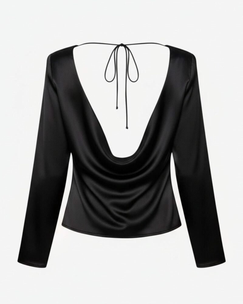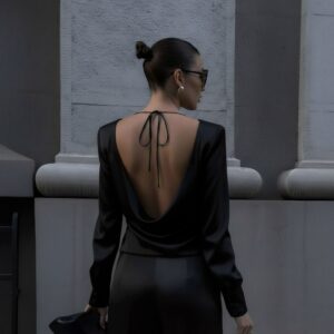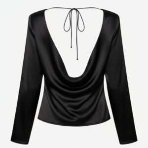 Elegancki top z jedwabiu, który łączy w sobie subtelną elegancję z nowoczesnym stylem. Wykonany z najwyższej jakości jedwabiu, zachwyca swoją miękkością oraz delikatnym połyskiem, który podkreśla każdy ruch. Top posiada subtelny dekolt w formie opadającego kołnierza oraz wyrafinowane wykończenie na plecach, z delikatnym wiązaniem, które dodaje mu wyjątkowego charakteru. Długie, lekko rozszerzane rękawy zapewniają wygodę i dodają całości lekkości. Idealny wybór na eleganckie wyjścia, wieczorne spotkania czy formalne okazje. Połącz go z klasycznymi spodniami lub spódnicą, aby stworzyć ponadczasową stylizację.