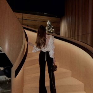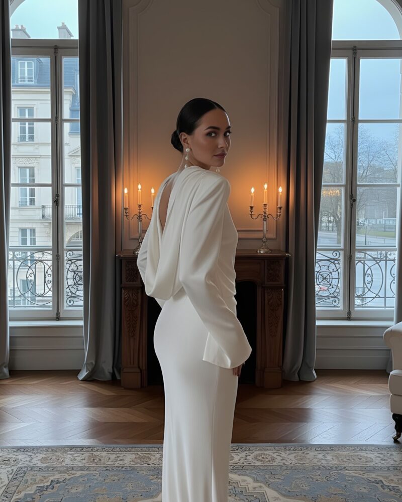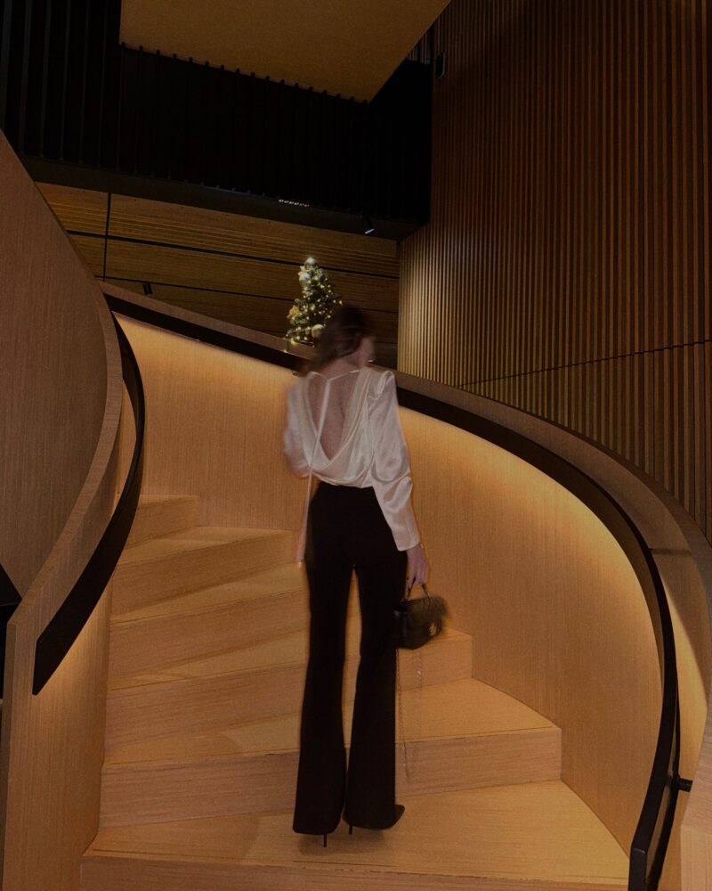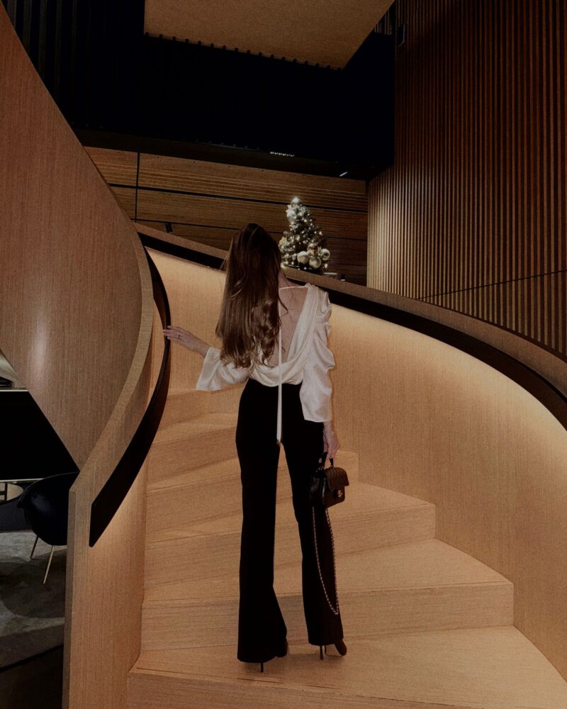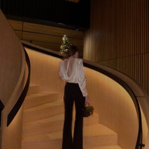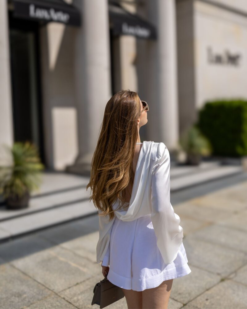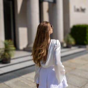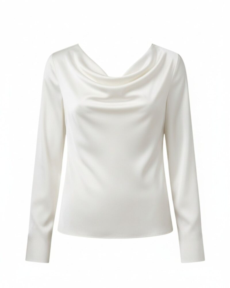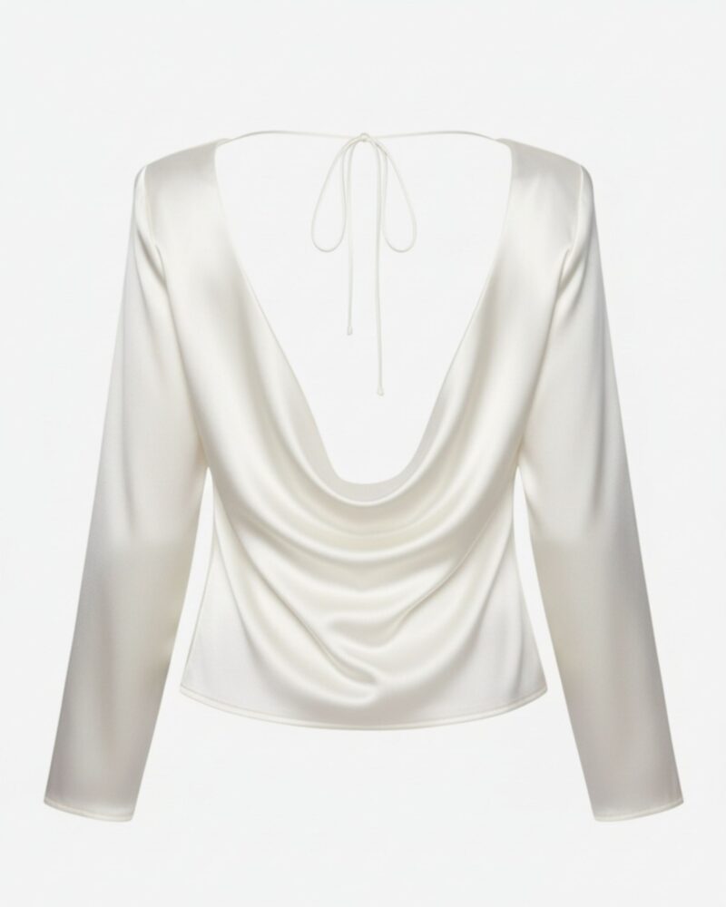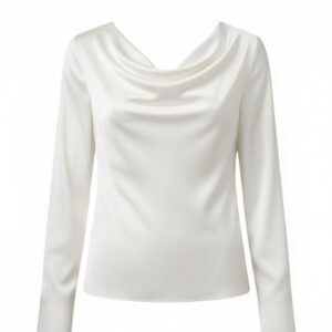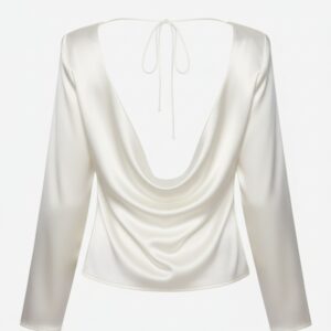 Elegancki top z jedwabiu, który łączy w sobie subtelną elegancję z nowoczesnym stylem. Wykonany z najwyższej jakości jedwabiu, zachwyca swoją miękkością oraz delikatnym połyskiem, który podkreśla każdy ruch. Top posiada subtelny dekolt w formie opadającego kołnierza oraz wyrafinowane wykończenie na plecach, z delikatnym wiązaniem, które dodaje mu wyjątkowego charakteru. Długie, lekko rozszerzane rękawy zapewniają wygodę i dodają całości lekkości. Idealny wybór na eleganckie wyjścia, wieczorne spotkania czy formalne okazje. Połącz go z klasycznymi spodniami lub spódnicą, aby stworzyć ponadczasową stylizację.