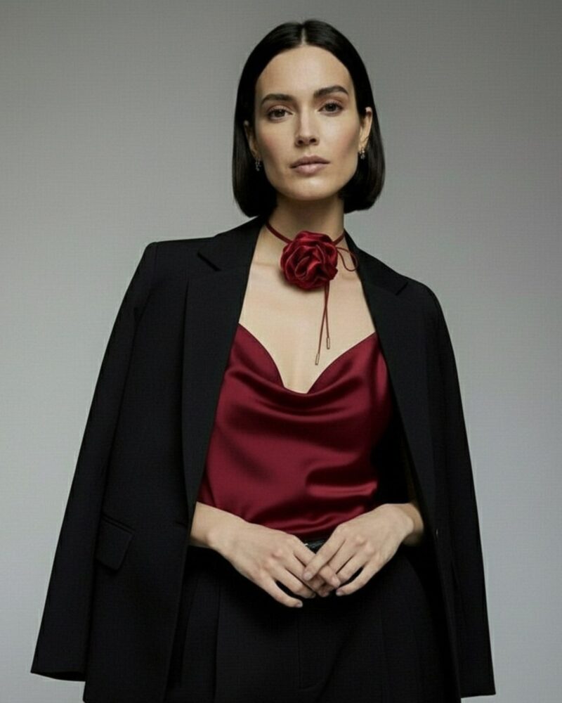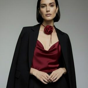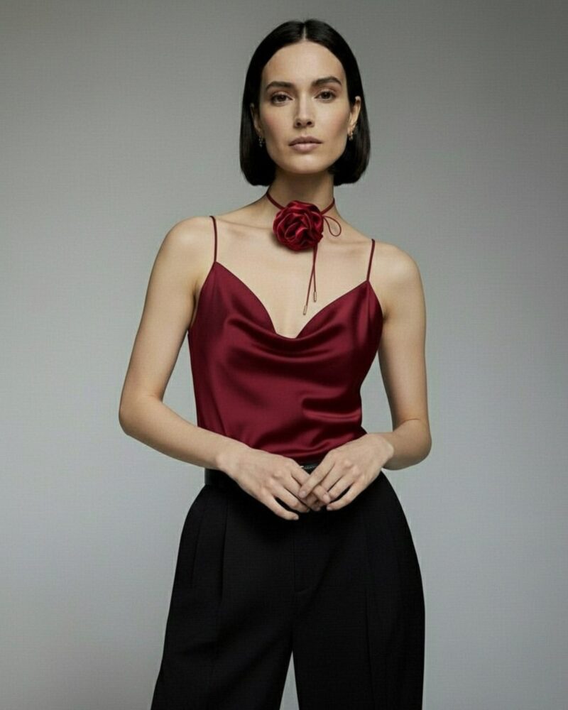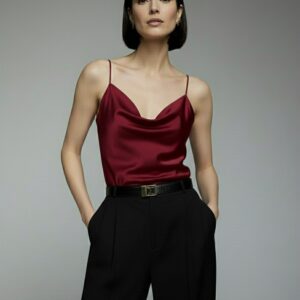 Elegancki jedwabny top z regulowanymi ramiączkami typu spaghetti i dekoltem w kształcie wody. Kwintesencja luksusu i idealna baza każdej kobiecej garderoby.