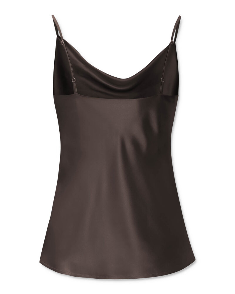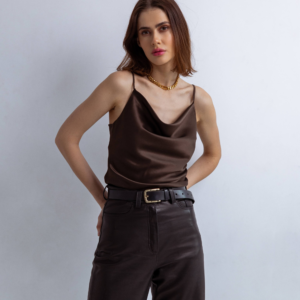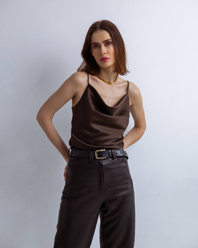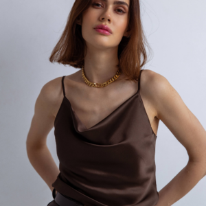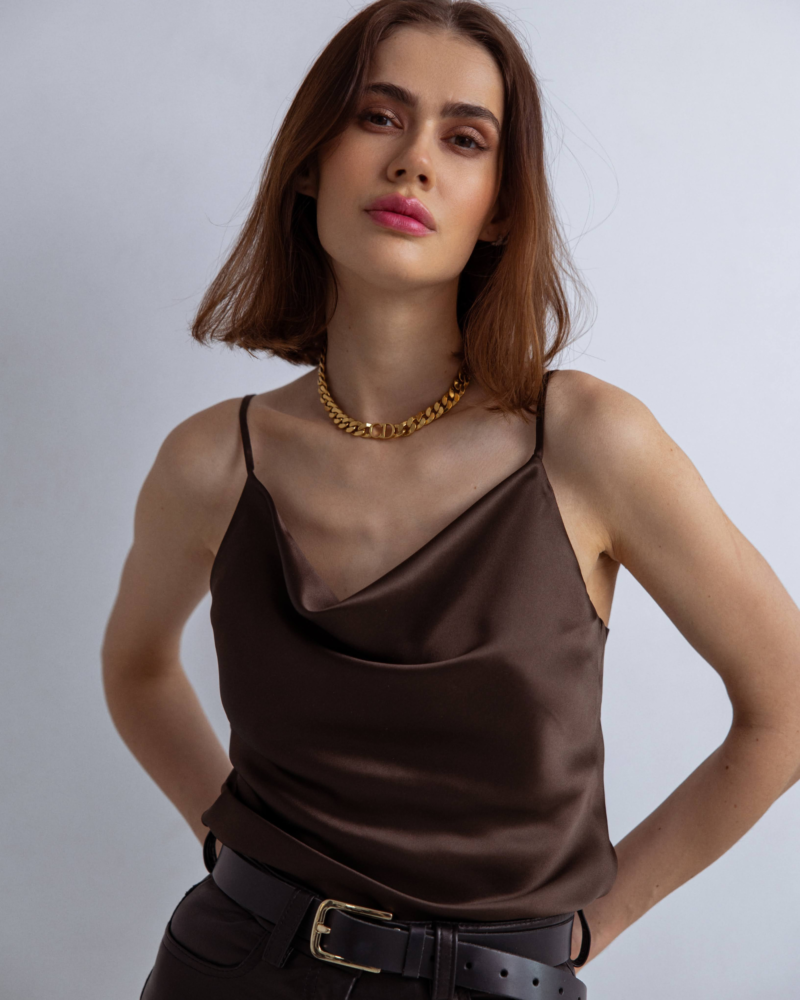 Elegancki jedwabny top z regulowanymi ramiączkami typu spaghetti i dekoltem w kształcie wody. Kwintesencja luksusu i idealna baza każdej kobiecej garderoby.