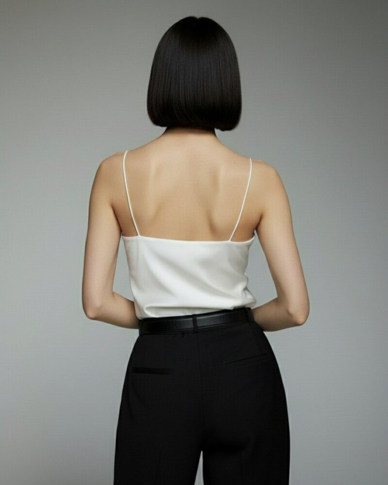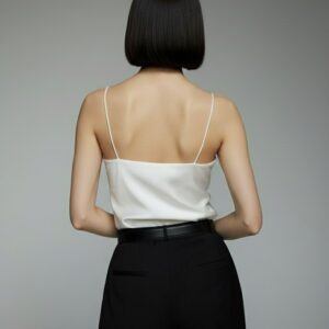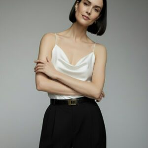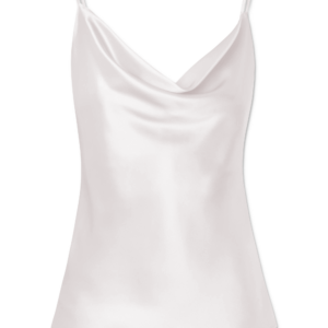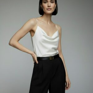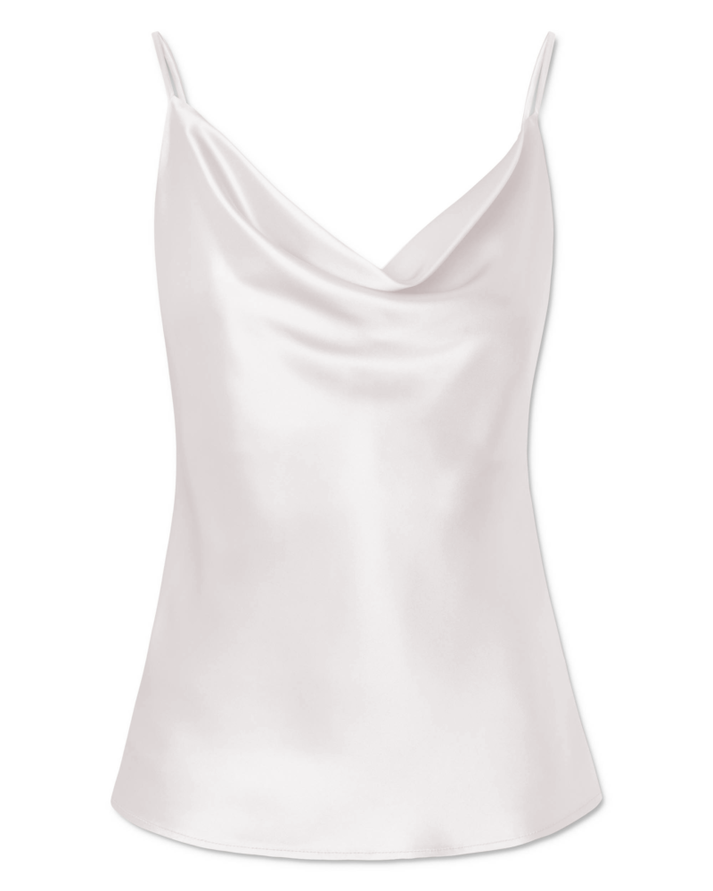 Elegancki jedwabny  top z regulowanymi ramiączkami typu spaghetti i dekoltem w kształcie wody. Kwintesencja luksusu i idealna baza każdej kobiecej garderoby.