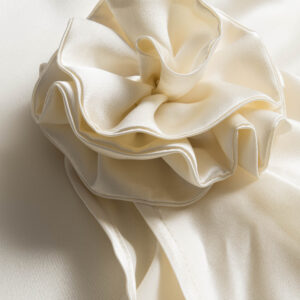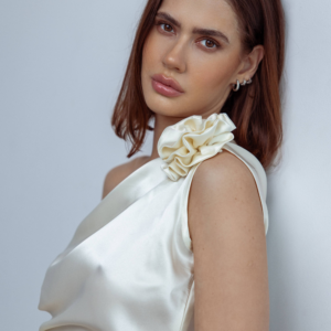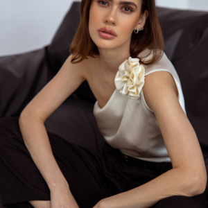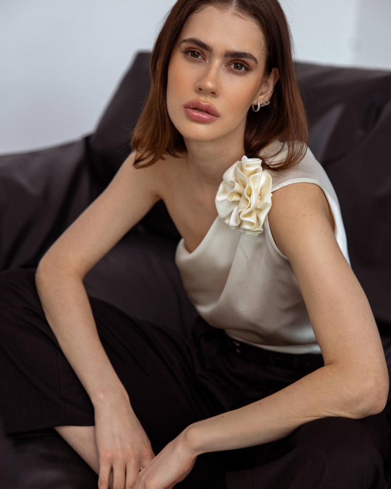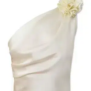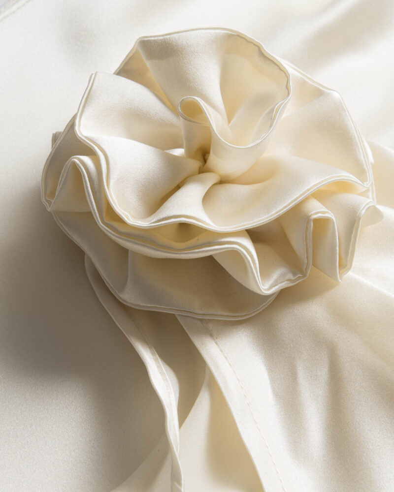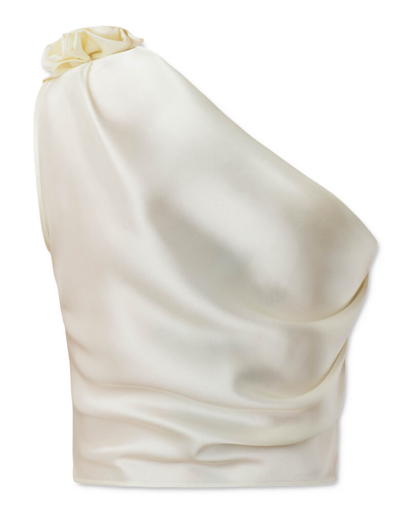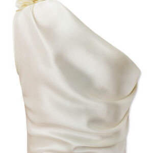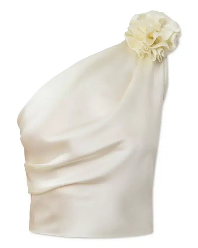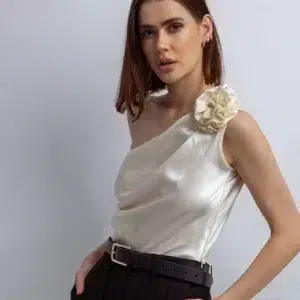 Elegancki jedwabny top na jedno ramię z marszczonymi detalami i jedwabną różą 3D.