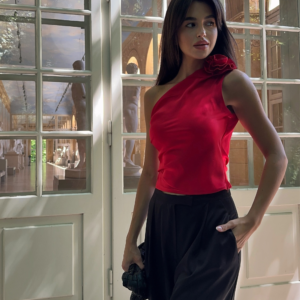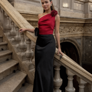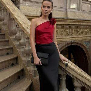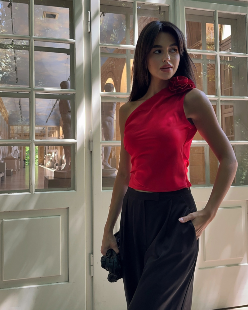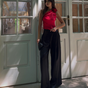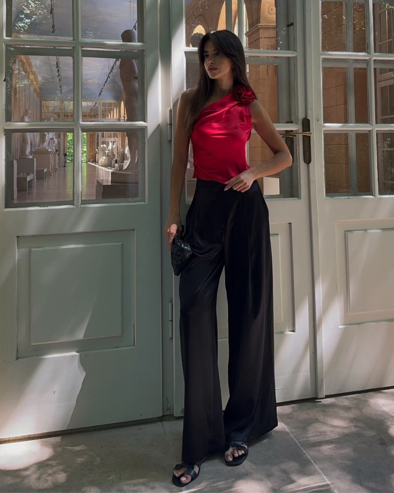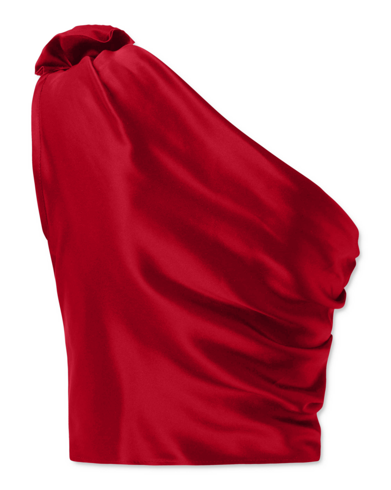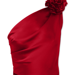 Elegancki jedwabny top na jedno ramię z marszczonymi detalami i jedwabną różą 3D.
