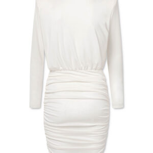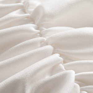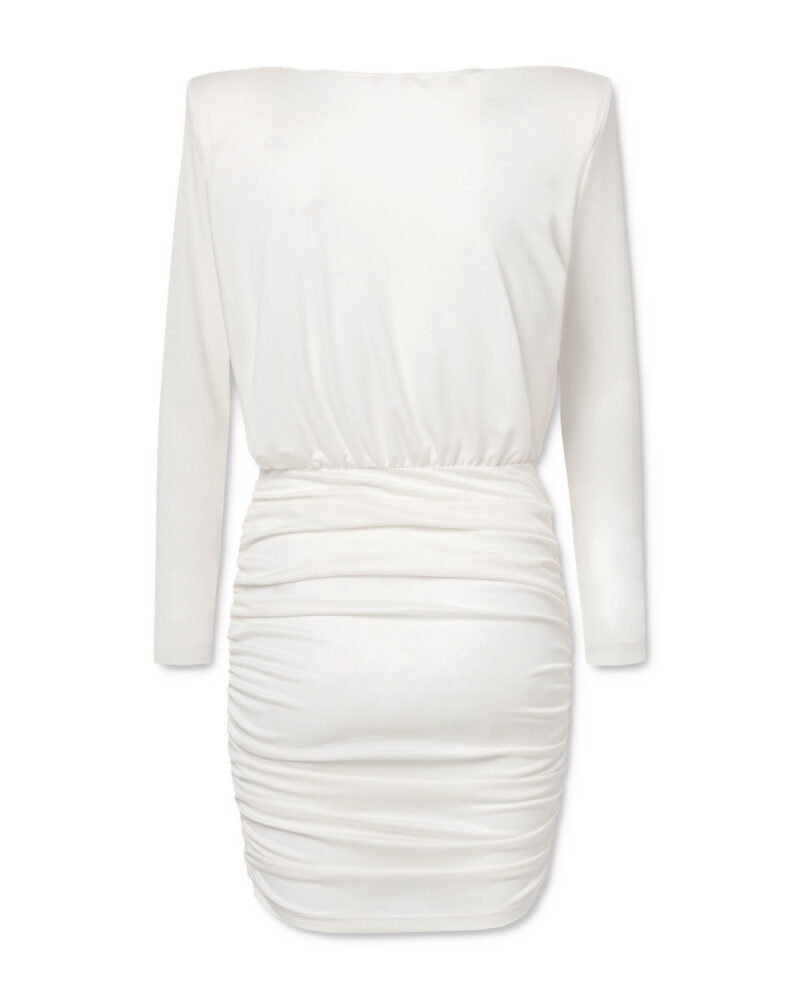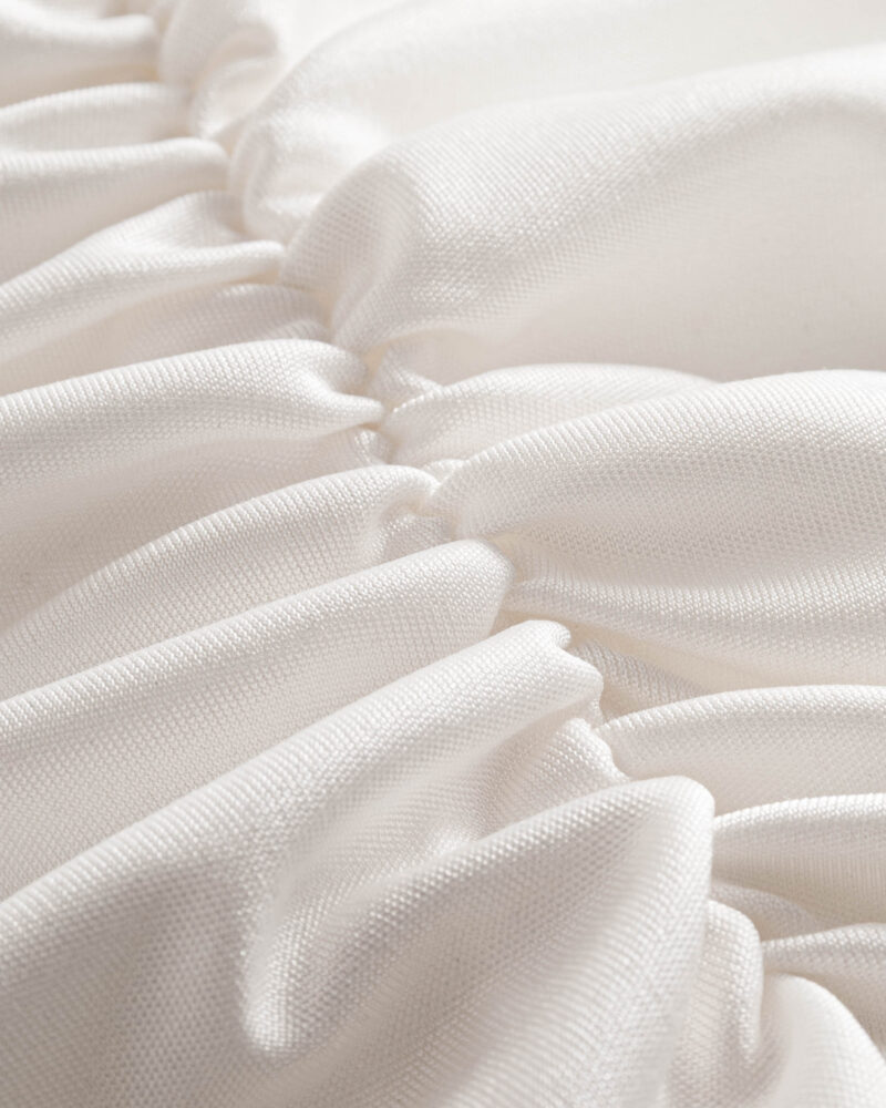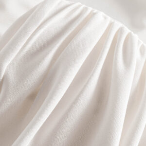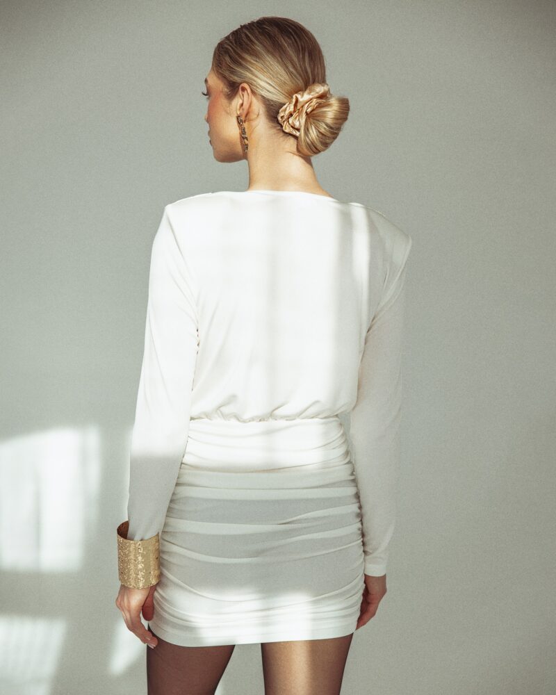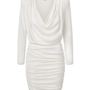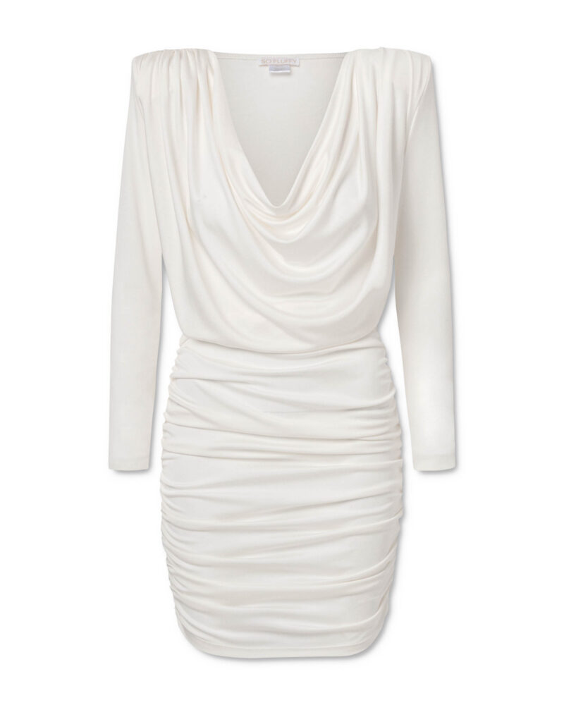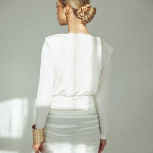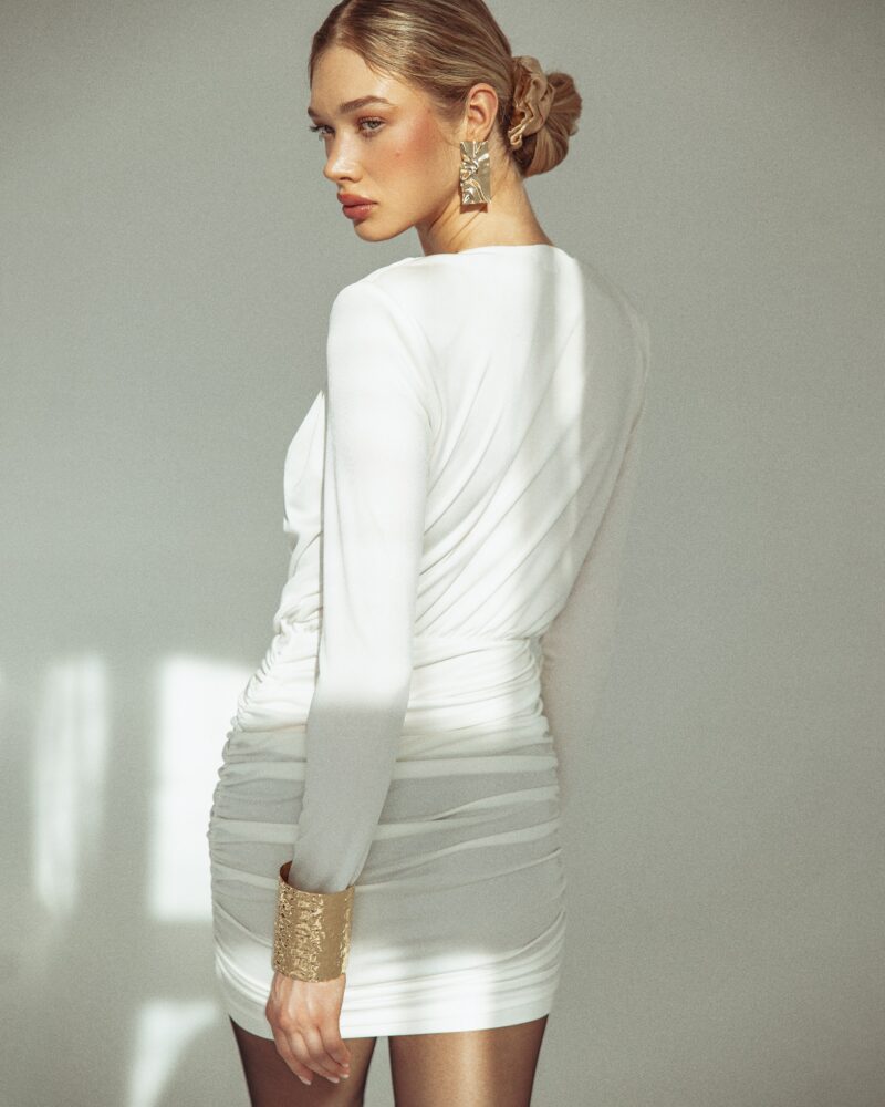 Charakterystyczny dekolt w kształcie wody z subtelnym drapowaniem nadaje sukience wyjątkowej struktury i lekkości, sprawiając, że każdy ruch wygląda płynnie i harmonijnie.