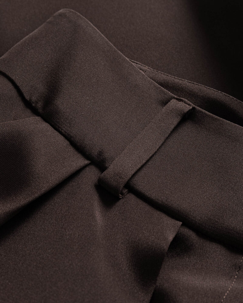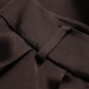 Eleganckie spodnie Talia zostały wykonane z wysokiej jakości jedwabiu, dzięki czemu gwarantują lekkość i swobodę ruchów, jednocześnie podkreślając naturalne proporcje sylwetki. Zapinane na dwa guziki, osadzone na grubym pasku ze szlufkami, zapewniają idealne dopasowanie w talii oraz wygodę noszenia przez cały dzień, niezależnie od okazji. Podwyższony stan dodatkowo podkreśla talię, a szerokie nogawki nie tylko pięknie układają się w ruchu, ale także optycznie wysmuklają nogi, nadając sylwetce lekkości i harmonii.