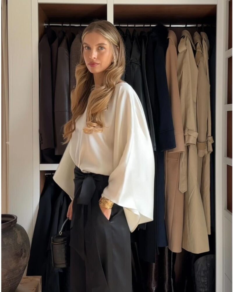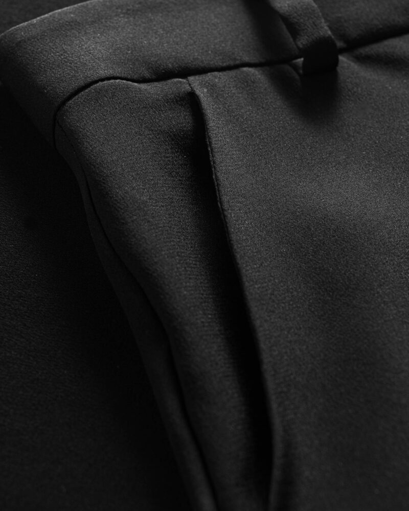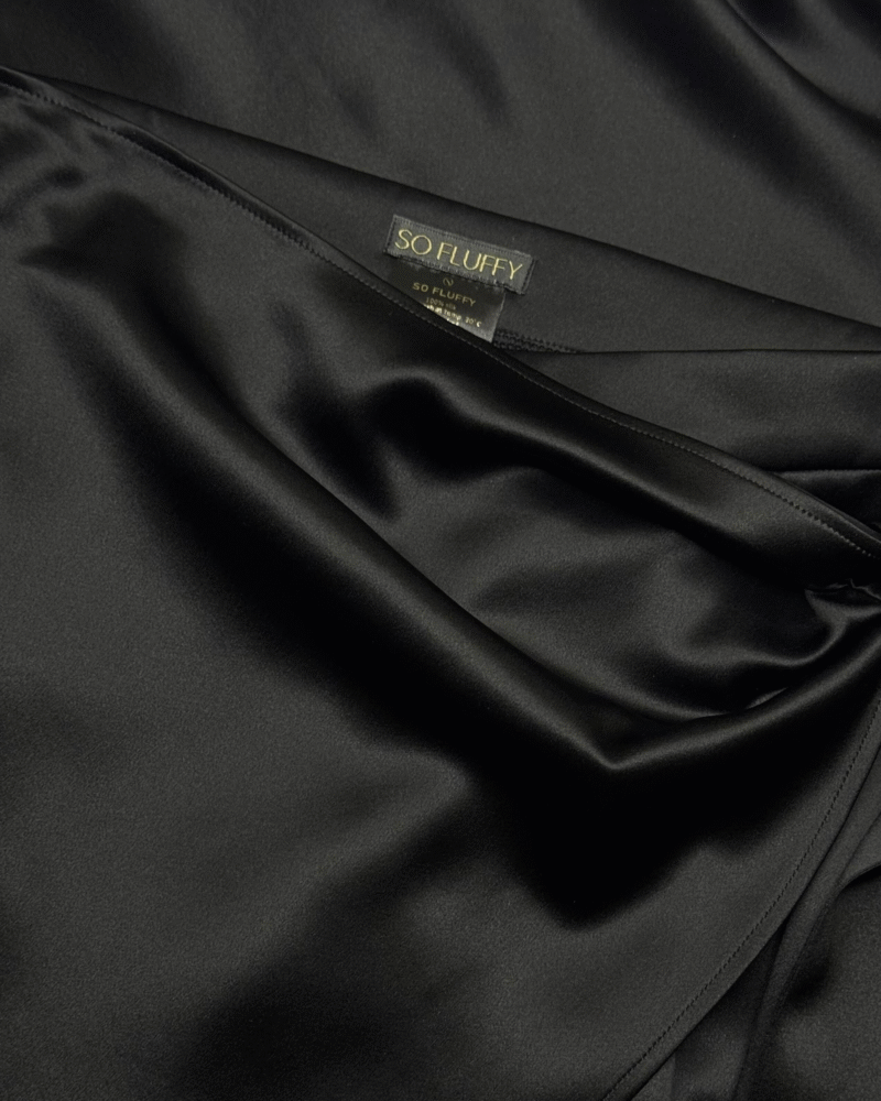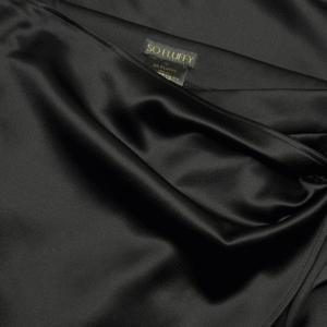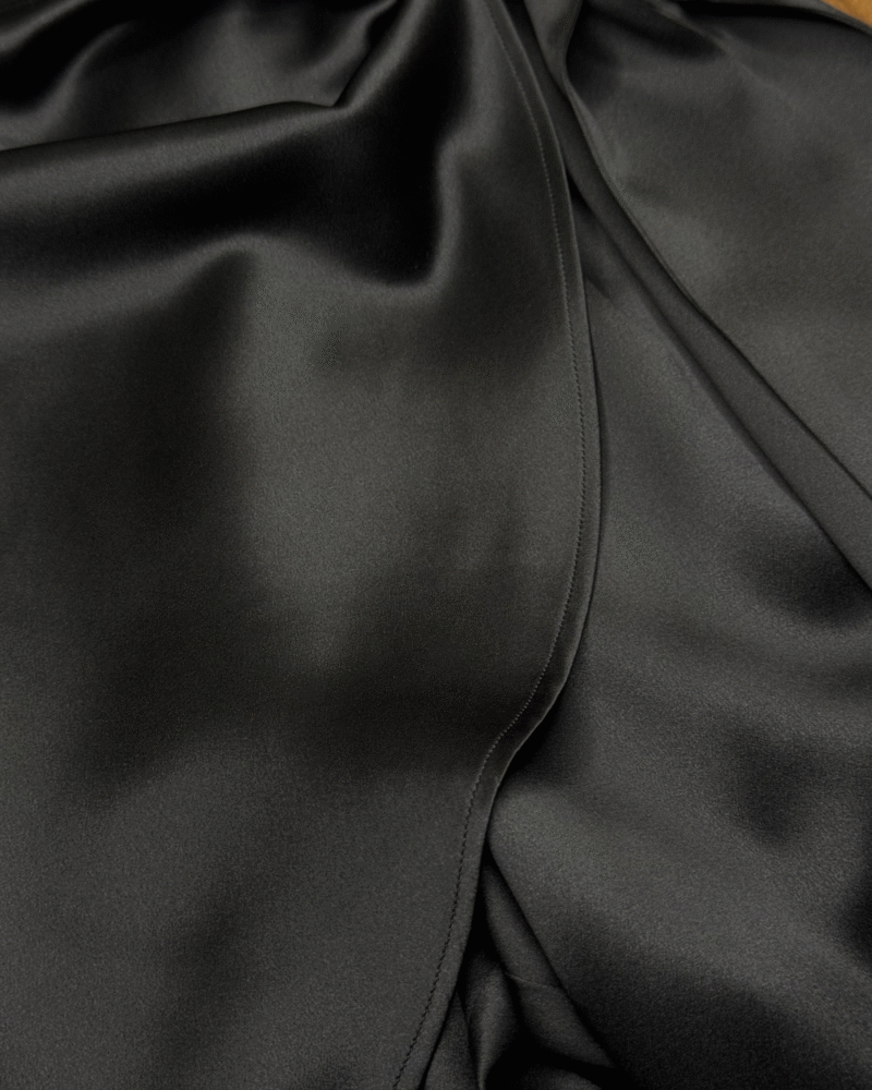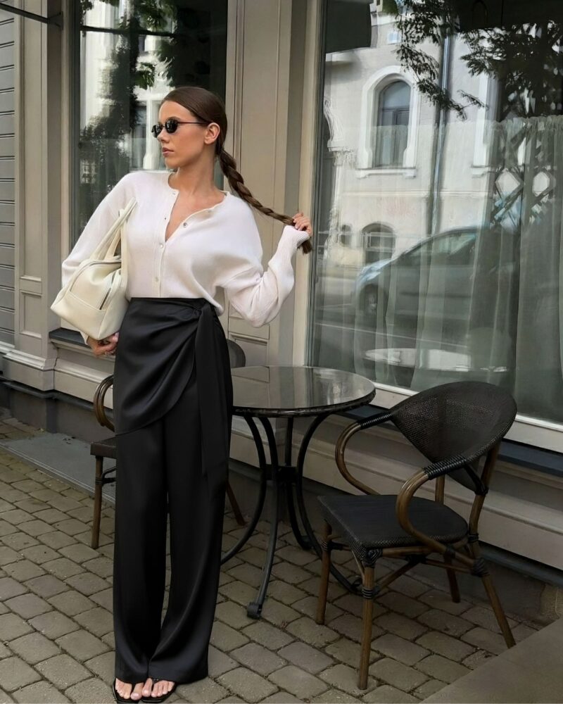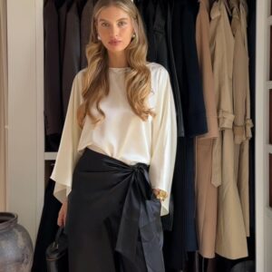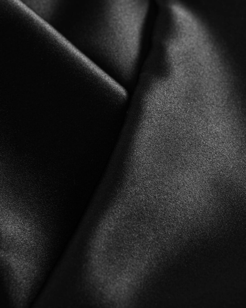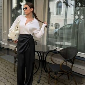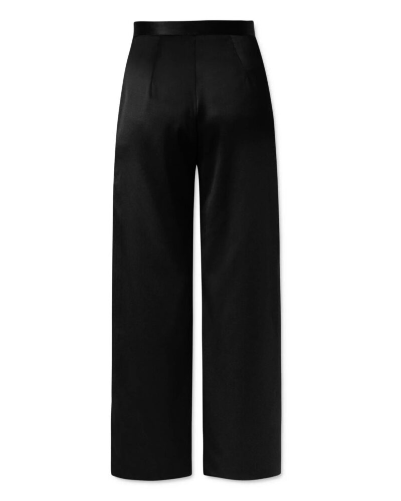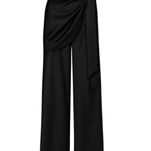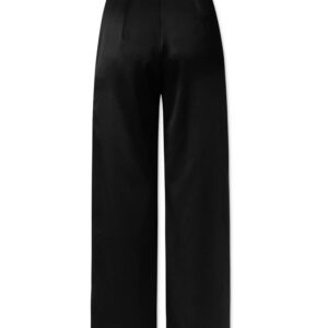 Te spodnie z jedwabnej satyny to elegancka propozycja, która łączy komfort z wyrafinowanym stylem. Wykonane z wysokiej jakości materiału, oferują subtelny połysk, który podkreśla ich luksusowy charakter. Model w klasycznej czerni z szerokimi nogawkami doskonale dopasowuje się do różnych stylizacji – zarówno tych na co dzień, jak i bardziej formalnych. Z przodu, dodatkowy detal w postaci szarfy nadaje im wyjątkowego charakteru. Tył spodni z eleganckim wykończeniem i prostej formie, zapewnia idealne dopasowanie. To doskonały wybór na wieczorne wyjścia lub ważne spotkania.